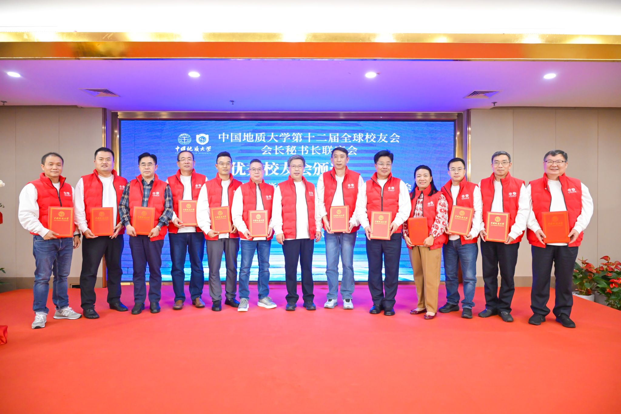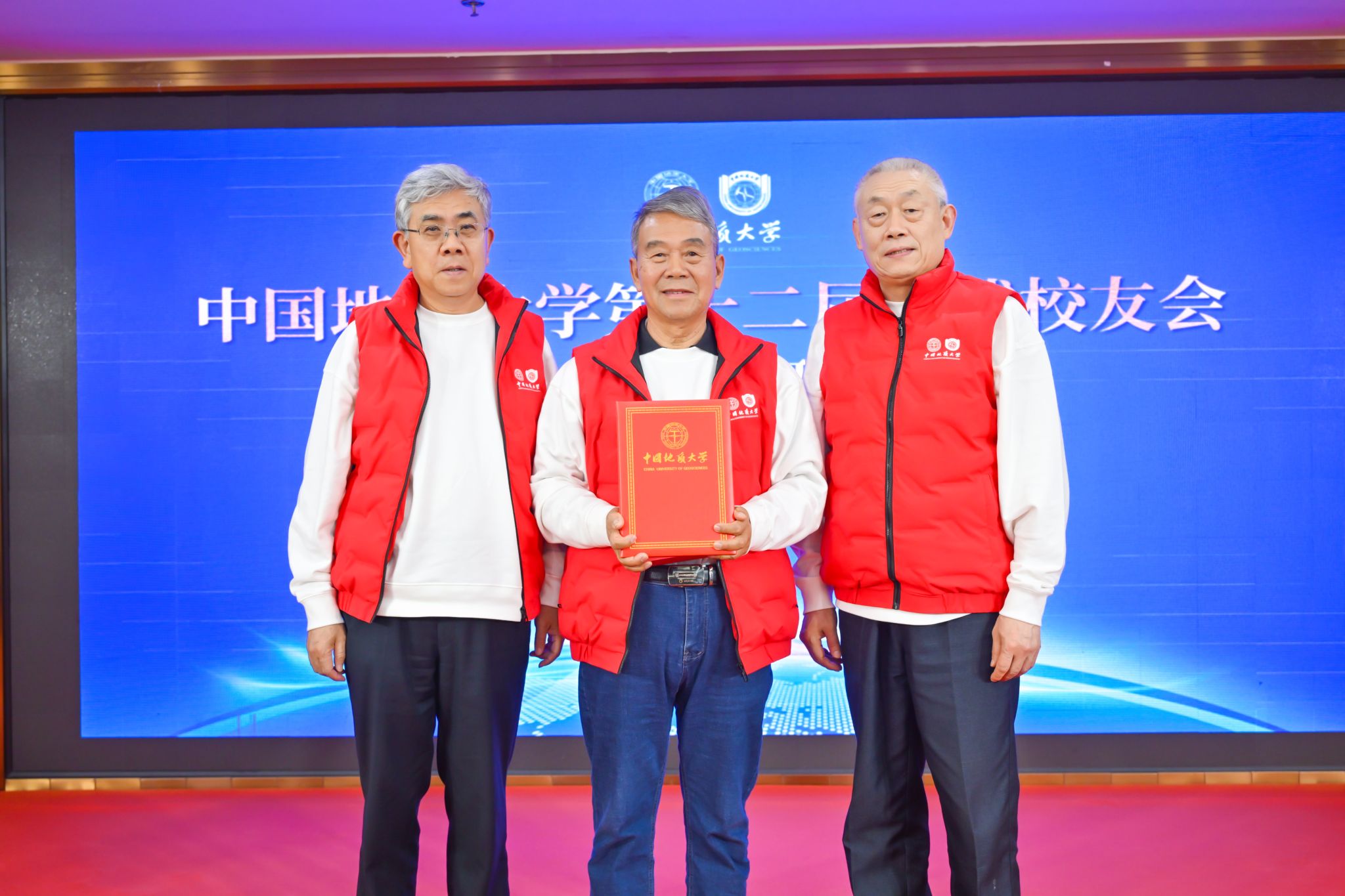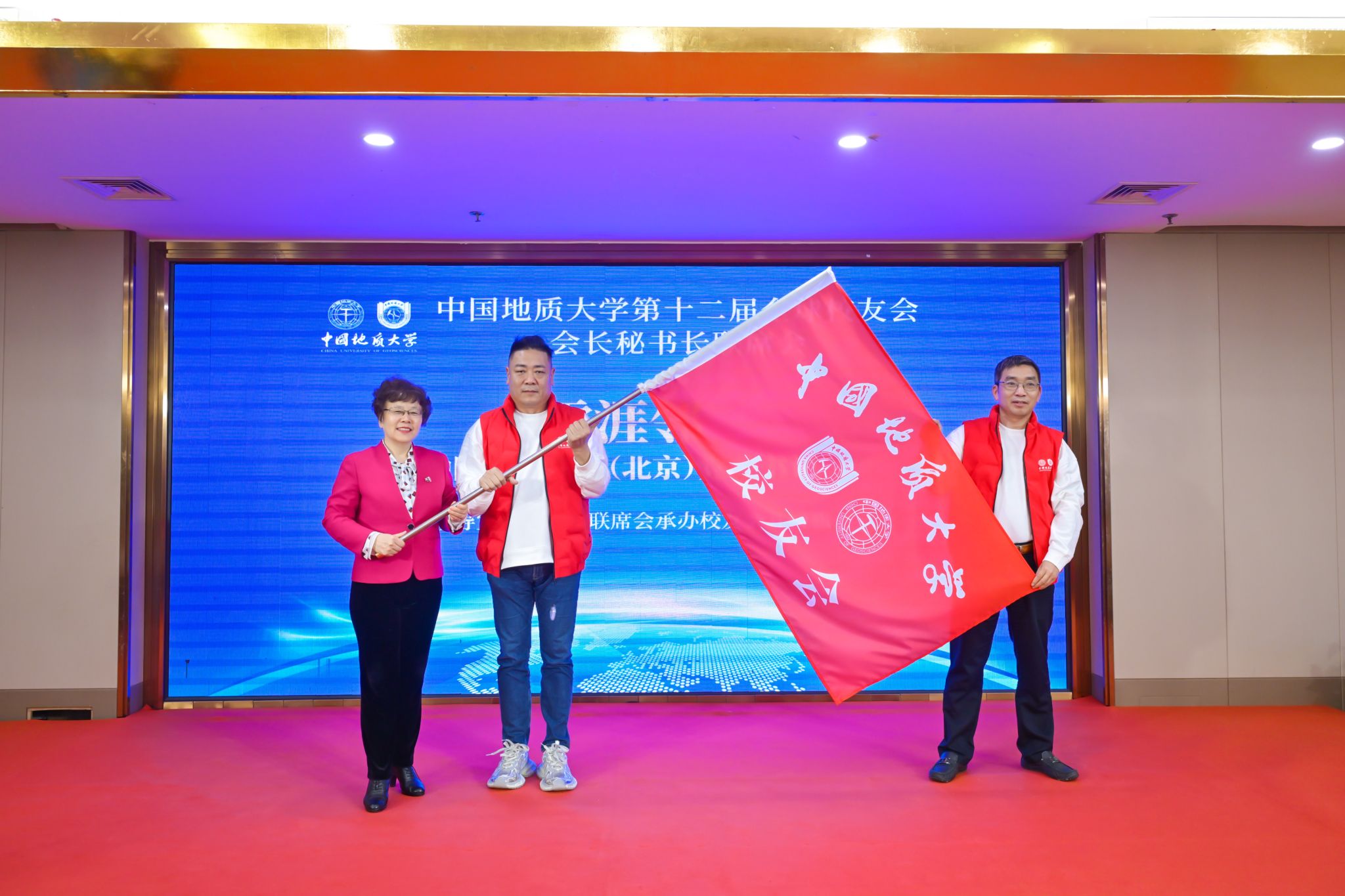雷涯邻为下一届地质资源环境高峰论坛暨全球校友会会长秘书长联席会承办单位湖南校友会授旗,湖南校友会常务副会长邓星平、秘书长周红桥共同接旗。