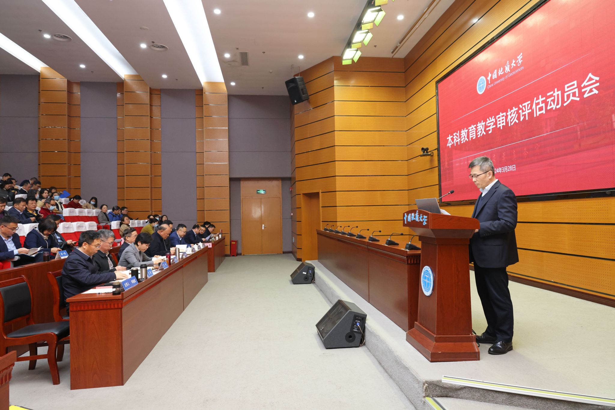 地大新闻网讯 (通讯员 饶炜龙 章帆 摄影 孙彦钦)3月28日,我校召开新一轮本科教育教学审核评估动员会,会议主题为“以审核评估为契机,全面提高本科人才自主培养能力”。在校校领导,党委常委,校长助理,教指委委员,教学督导组成员,各管理服务机构主要负责人,各学院主要负责人、专业负责人、教学秘书、辅导员,教师代表,学生代表共300余人参加会议。副校长李建威主持会议。