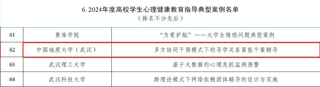 《多方协同干预模式下的导学关系紧张个案辅导》是我校医校协同高效运转的一项成功育人案例。案例反映出多年来学校构建家校医协同干预机制、加强心理健康教育队伍建设、开展具有地学特色的心理健康教育工作等举措,有效筑牢了心理健康安全防线,有效保障了学生的心理健康和生命安全。