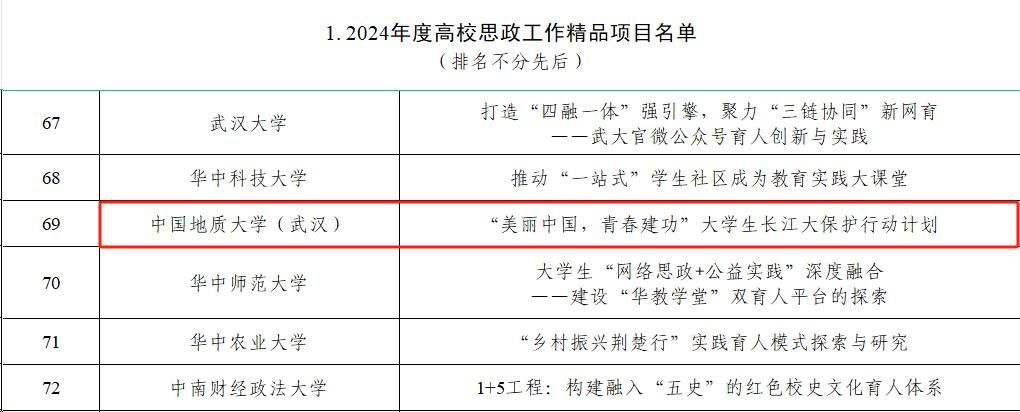 地大新闻网讯(记者 梁睿华 许小康)日前,教育部公布了2024年度思想政治工作质量提升综合改革与精品建设项目入选名单,我校共有两个项目入选。《“美丽中国 青春建功”大学生长江大保护行动计划》入选高校思政工作精品项目,《多方协同干预模式下的导学关系紧张个案辅导》入选高校学生心理健康教育指导典型案例。