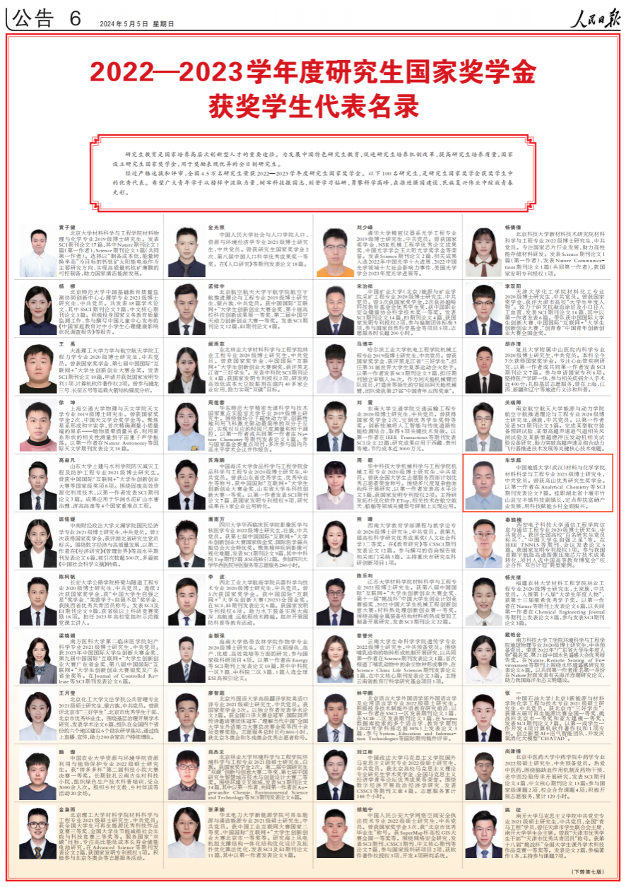 地大新闻网讯 2022—2023学年,全国4.5万人荣获研究生国家奖学金。5月5日,《人民日报》用多个整版刊登了其中100位优秀研究生代表的事迹简况。我校2021级博士研究生车华超名列其中。