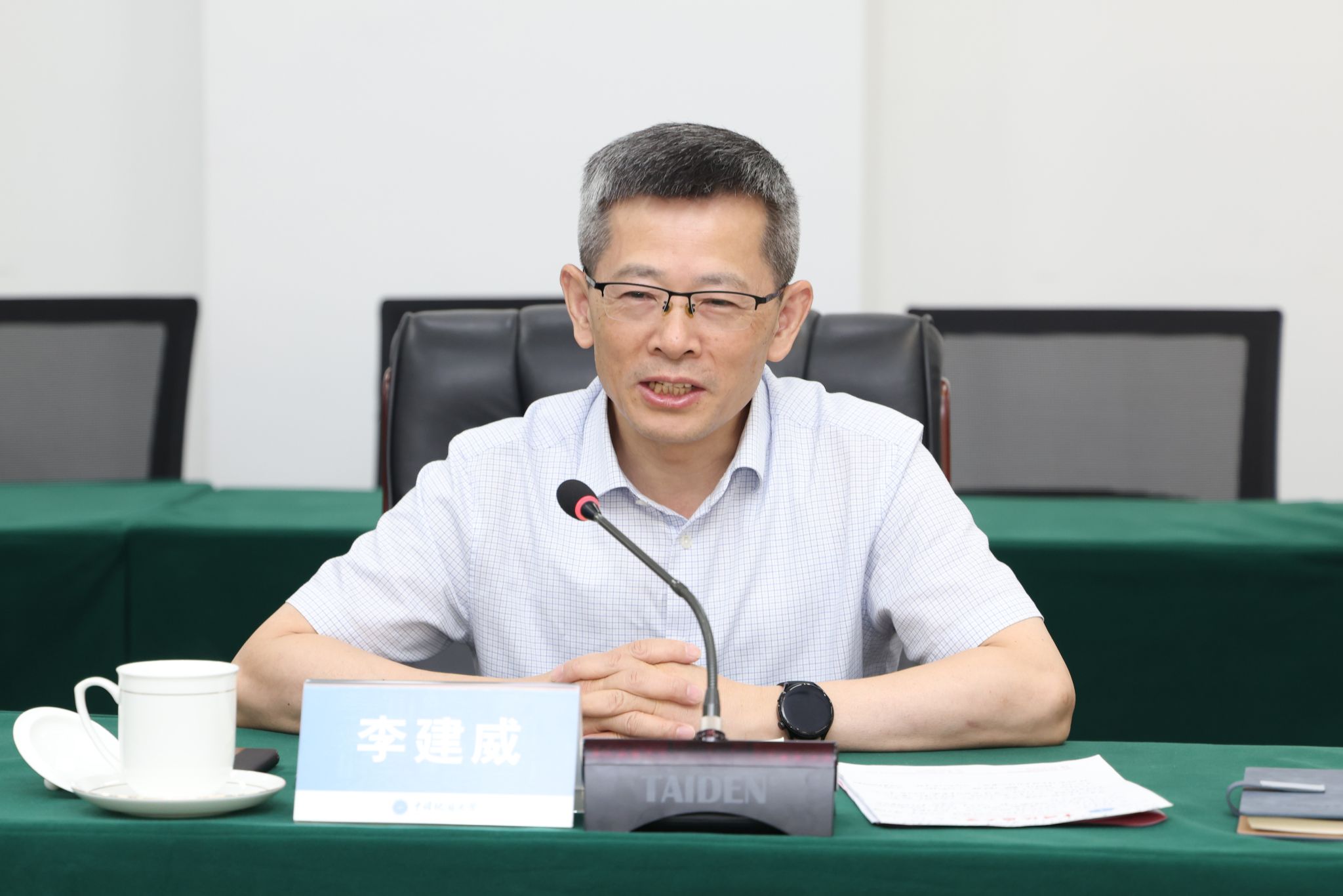 李建威介绍学校总体发展情况。他表示,同为行业特色型大学,两校在发展历程中有许多相似之处。他指出,两校要坚持党的教育方针,传承红色基因,沉淀精神内涵,扎根中国大地,培养具有家国情怀、教育情怀和育人使命的人才队伍。他希望两校能不断深化沟通、搭建平台,与区域发展携手共进,共同促进党建引领学科发展、人才引进、校园文化及援疆工作等方面建设。