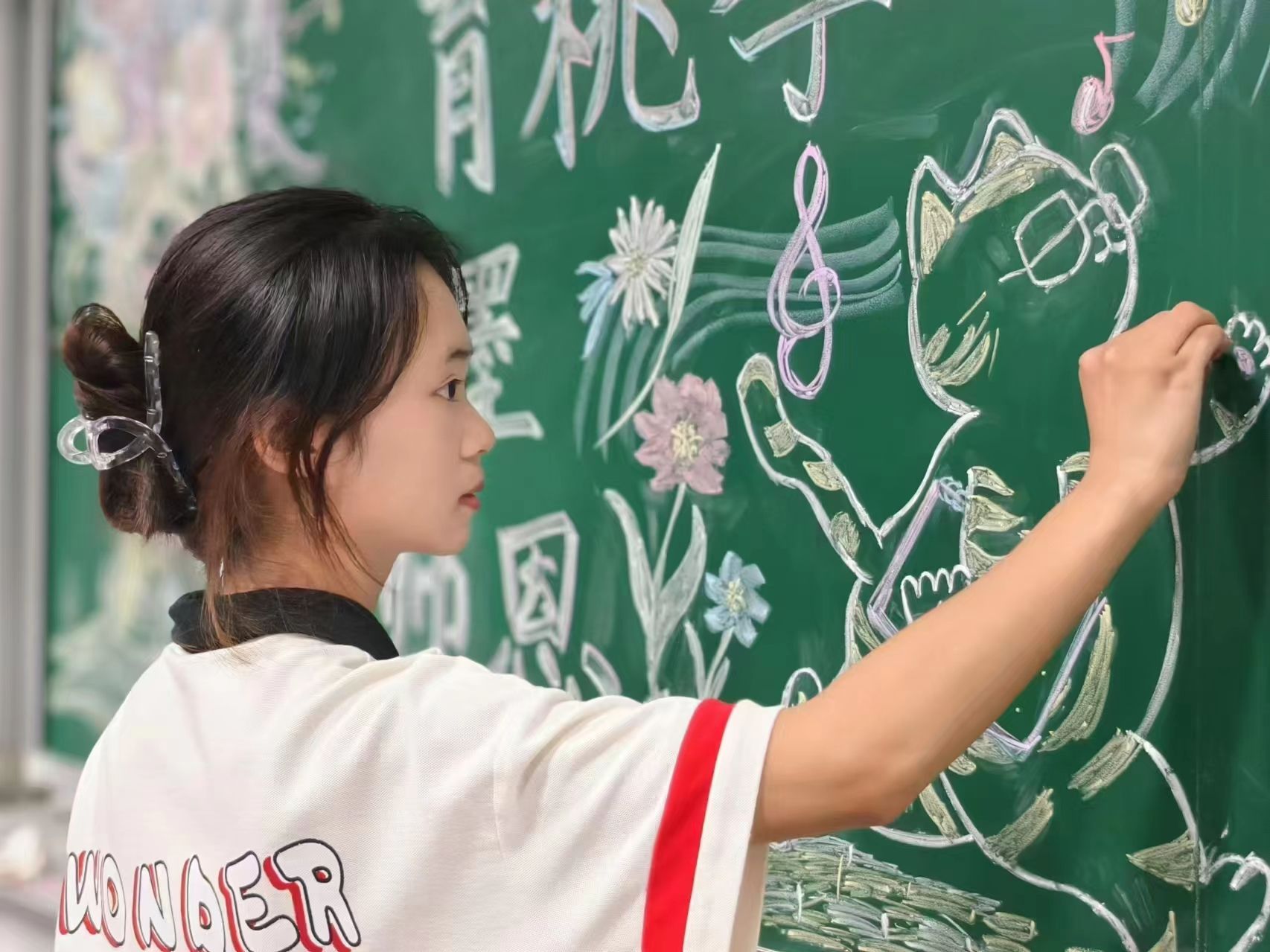 “在教师节这天,带领广大同学向老师表达敬意和感谢已经成为我们的惯例,自2021年起,从绘制板画到隧道壁画,再到装饰教学楼的台阶……四年间已有上千名同学参与其中。今年除了绘制板画,我们还专门制作了节日海报,和后勤的工作人员一起,将两校区所有教室的多媒体设备壁纸都替换了。”校“青马工程”学员、学生会执行主席孙佳怡介绍道。