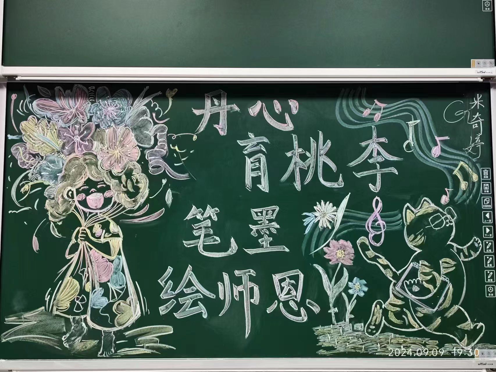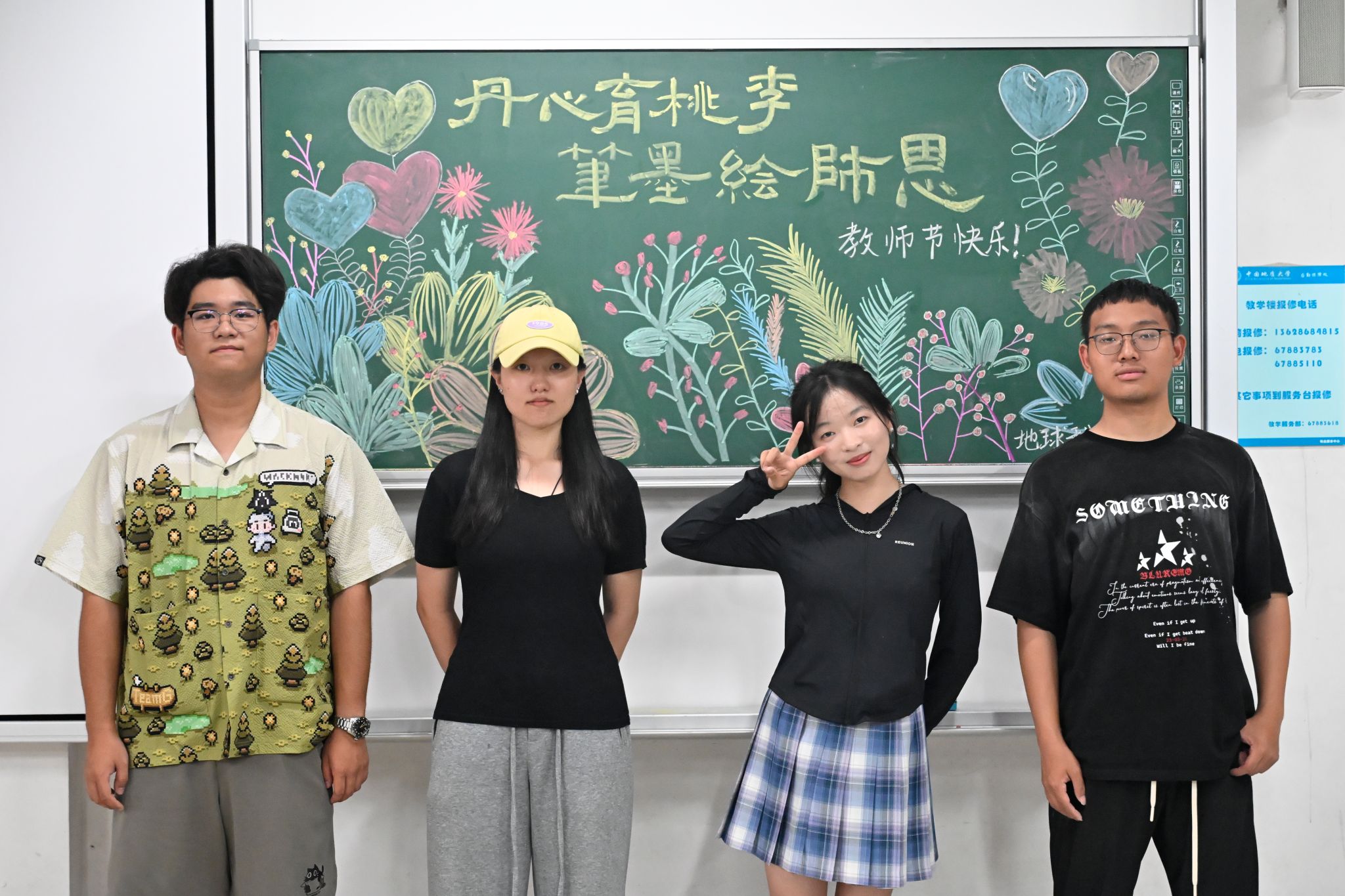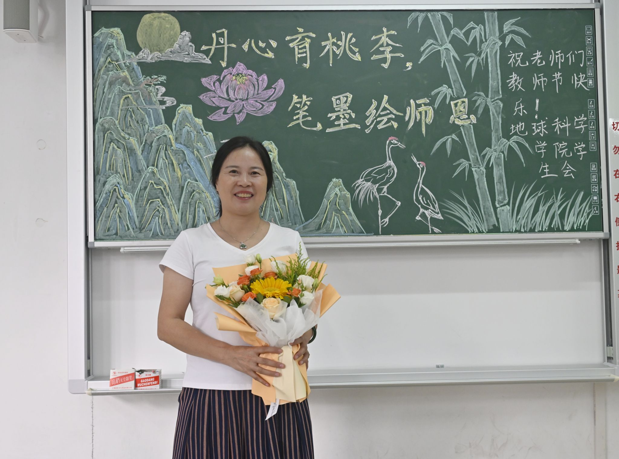 地大新闻网讯(通讯员 蒋秋香 田雯惠 刘明辉 )9月10日清晨,当材料与化学学院王群英老师步入教室时,一幅精美的板画映入眼帘。“王老师,您好!祝您教师节快乐!”班上的同学献上鲜花,并齐声送上祝福。王老师感动得眼角湿润,以爽朗的笑声回应了学生们的心意。这一刻,在我校两校区百余间教室内,都上演着同样温馨的一幕。