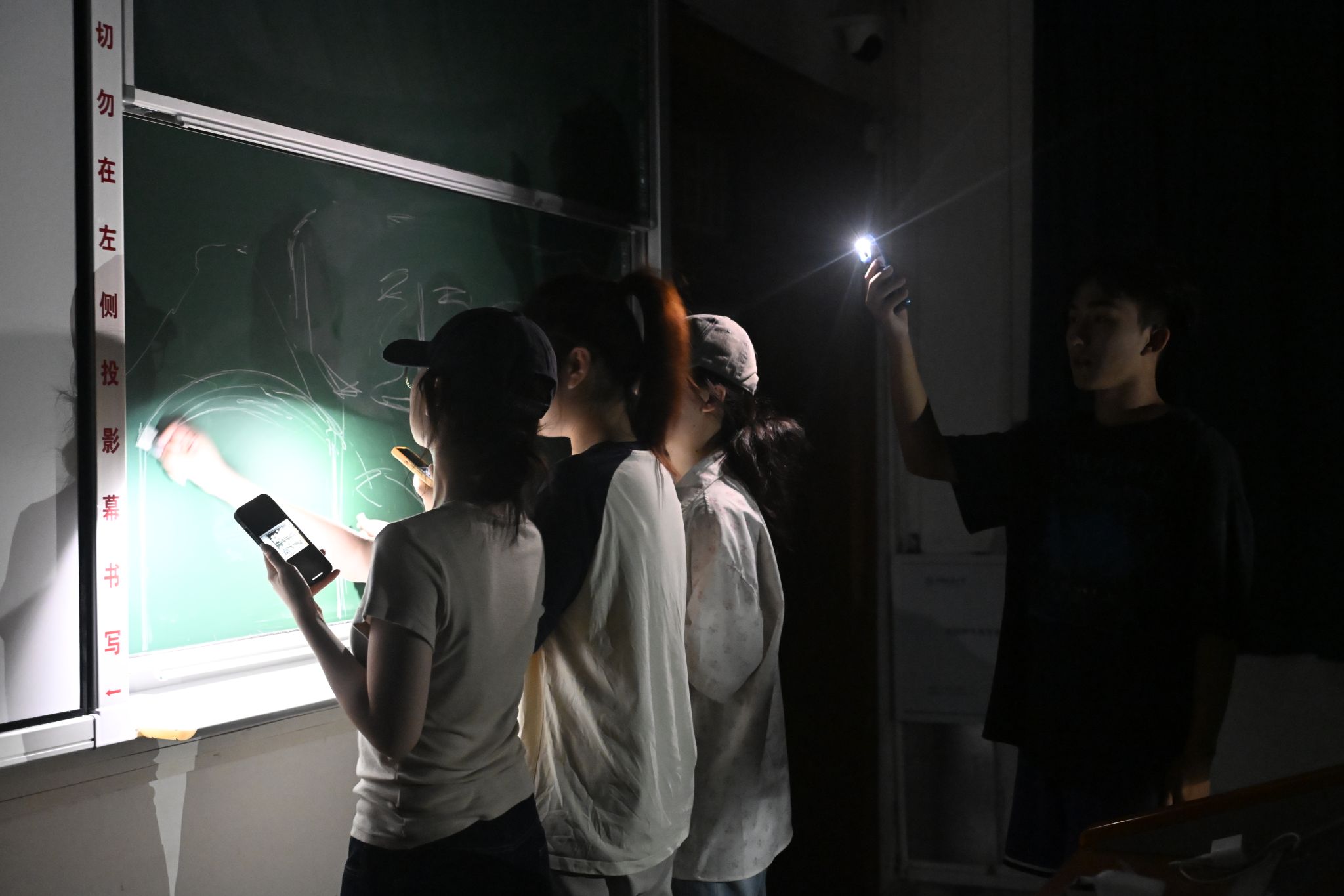 学生在手机灯光下绘制板画 摄影 李恒一