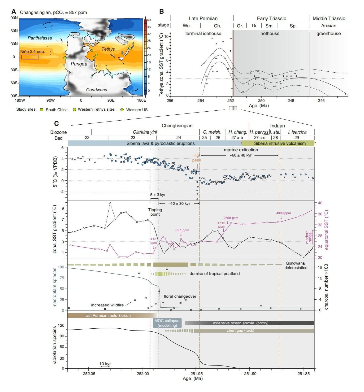 短尺度的气候变率在深时古气候研究中涉及极少,通常隐藏在背景态气候变化中。本文使用牙形石氧同位素古温度计重建特提斯洋的东西纬向海温差,并利用复杂地球系统科学模式模拟和沉积学证据互为验证,建立了一个二叠纪末海—气耦合过程的新模型。研究指出二叠纪末期向变率增强的新气候态的转变可能非常迅速,可能发生在2到8千年以内,比海洋大灭绝开始的时间早1到7万年。由于上二叠统海洋动物群保持了多样性,一般认为海相灭绝之前没有发生环境扰动。然而,三分之二的西伯利亚熔岩喷发发生在灭绝之前,与逐渐增强的厄尔尼诺—南方涛动活动相吻合。包括陆地森林退化、经向环流崩溃、海洋浮游生物灭绝和珊瑚礁消亡在内的重大危机都发生在大气二氧化碳分压由410ppm 翻倍至857ppm期间,并且与特提斯赤道纬度海温梯度的下降相吻合。