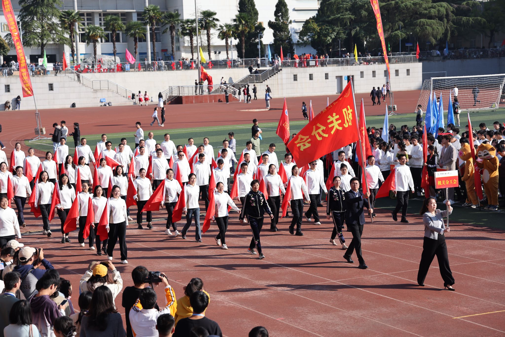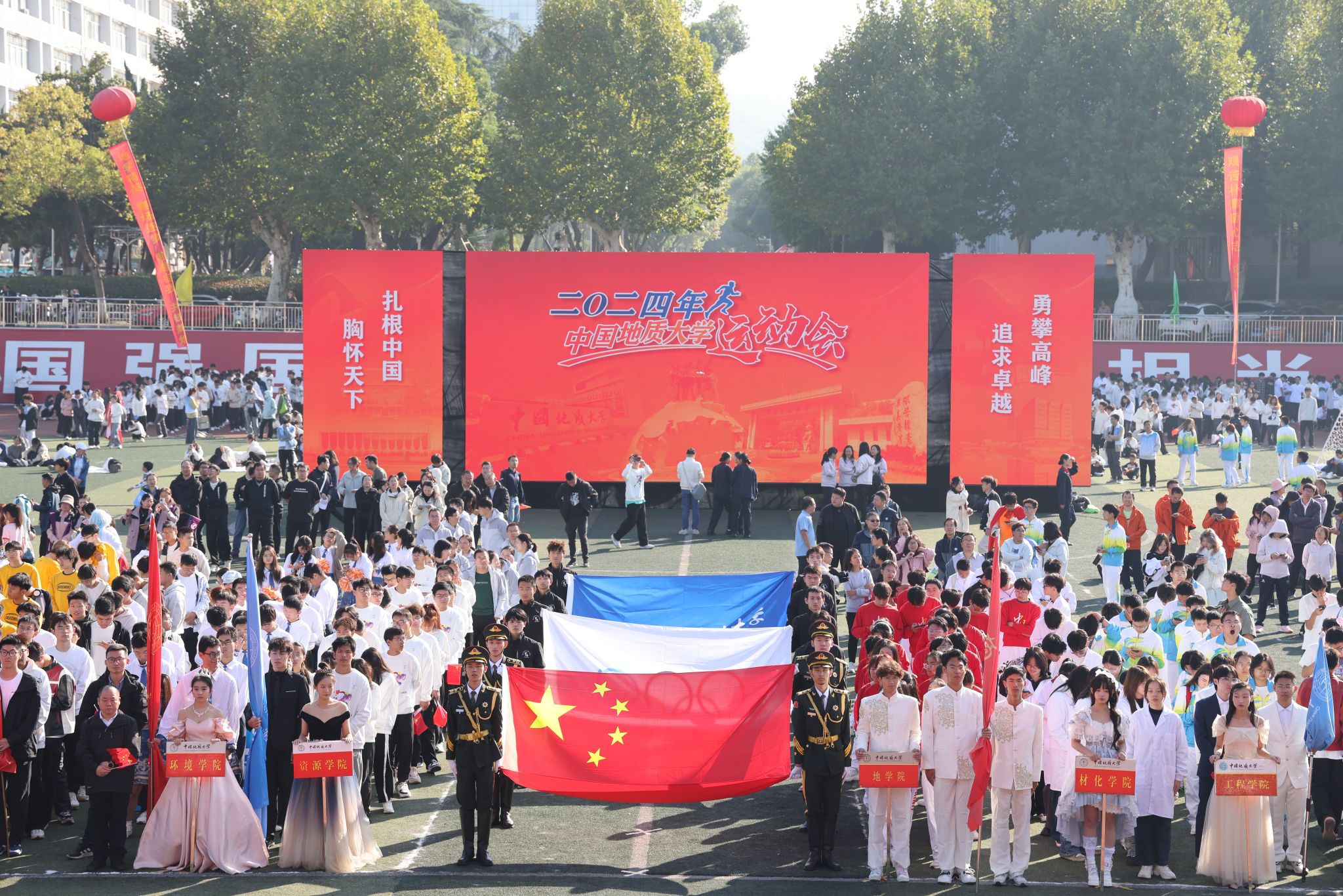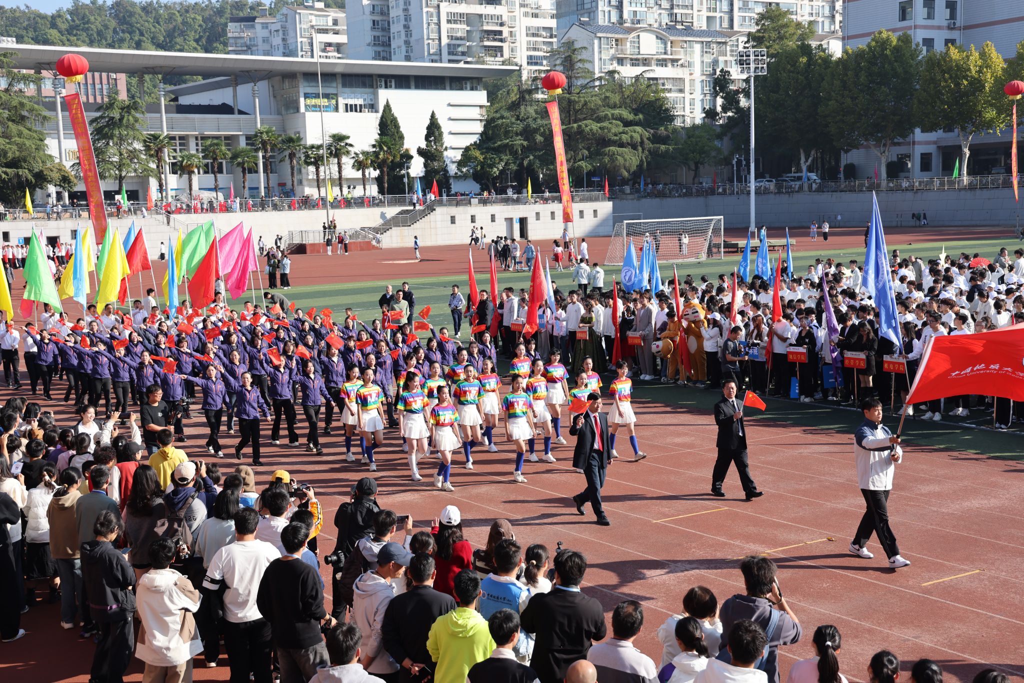 地大新闻网讯 呐喊与欢呼交织,动感与青春碰撞。运动场上旌旗飘扬,热闹非凡。10月25日,我校2024年秋季运动会在南望山校区西区运动场举行。校领导刘杰、王华、唐忠阳、王甫,党委常委、组织部部长陈文武,学校各二级单位负责人以及各分工会、各学院代表队参加开幕式。