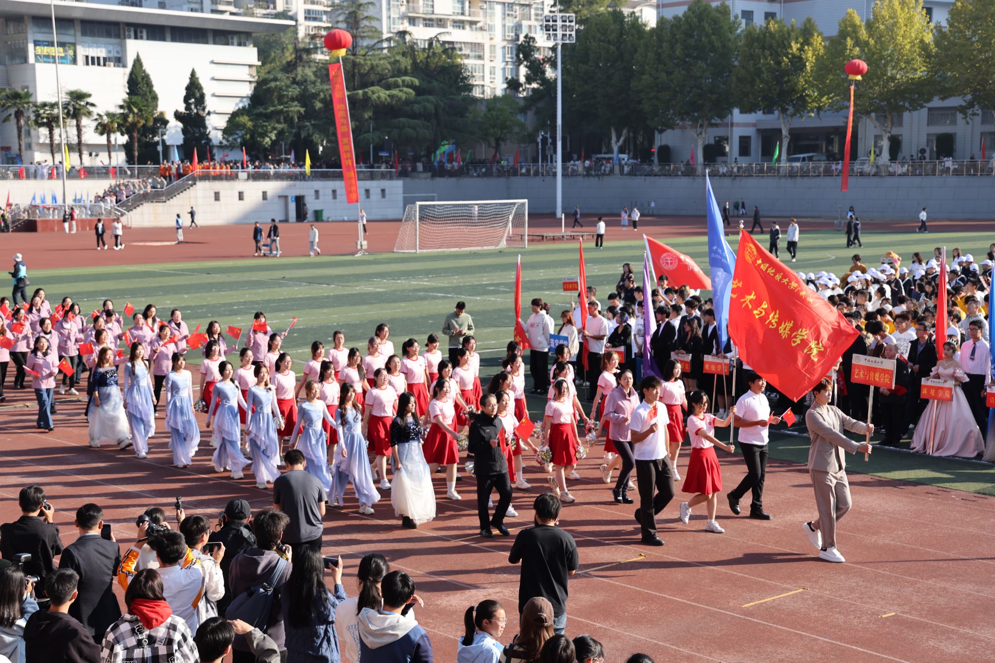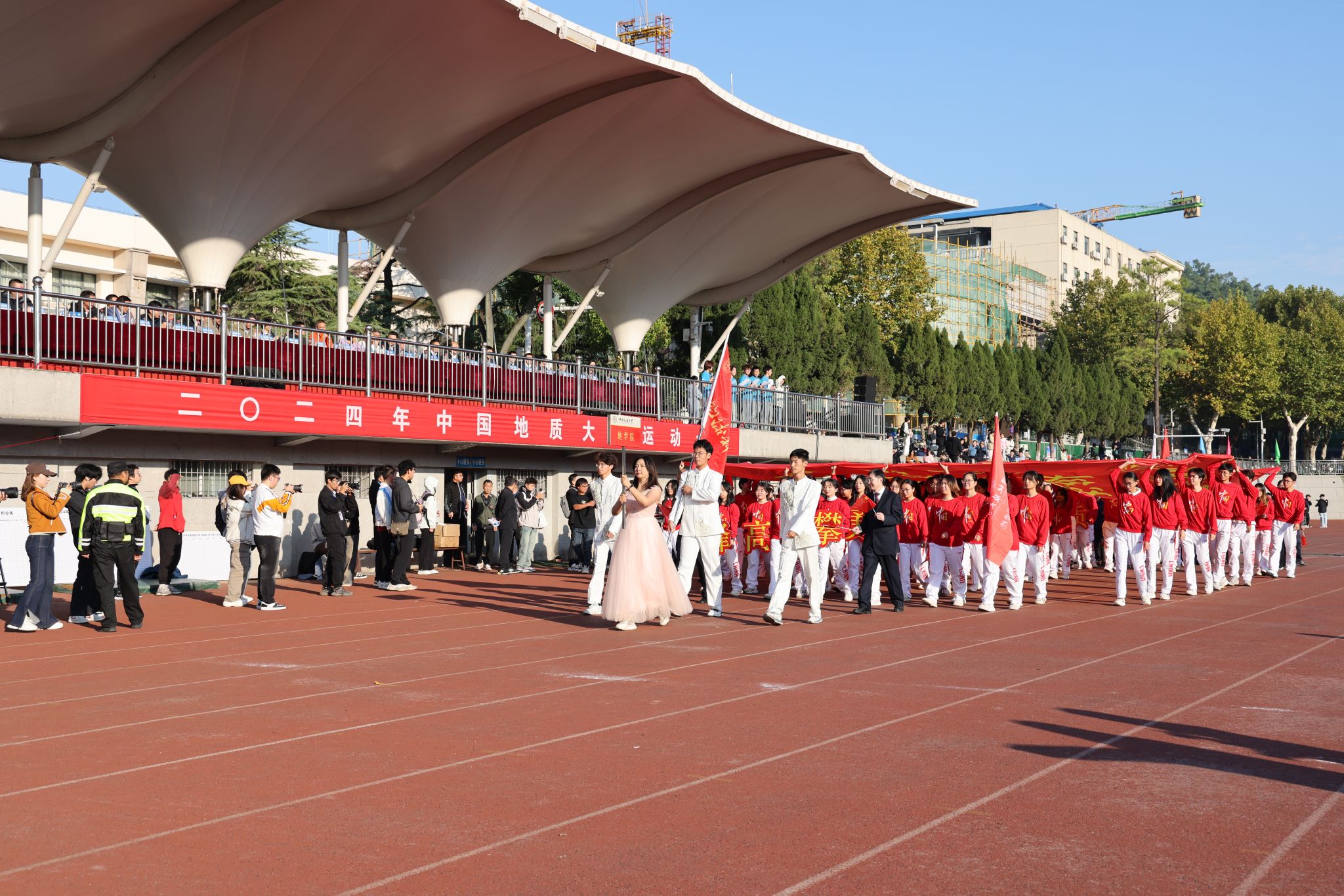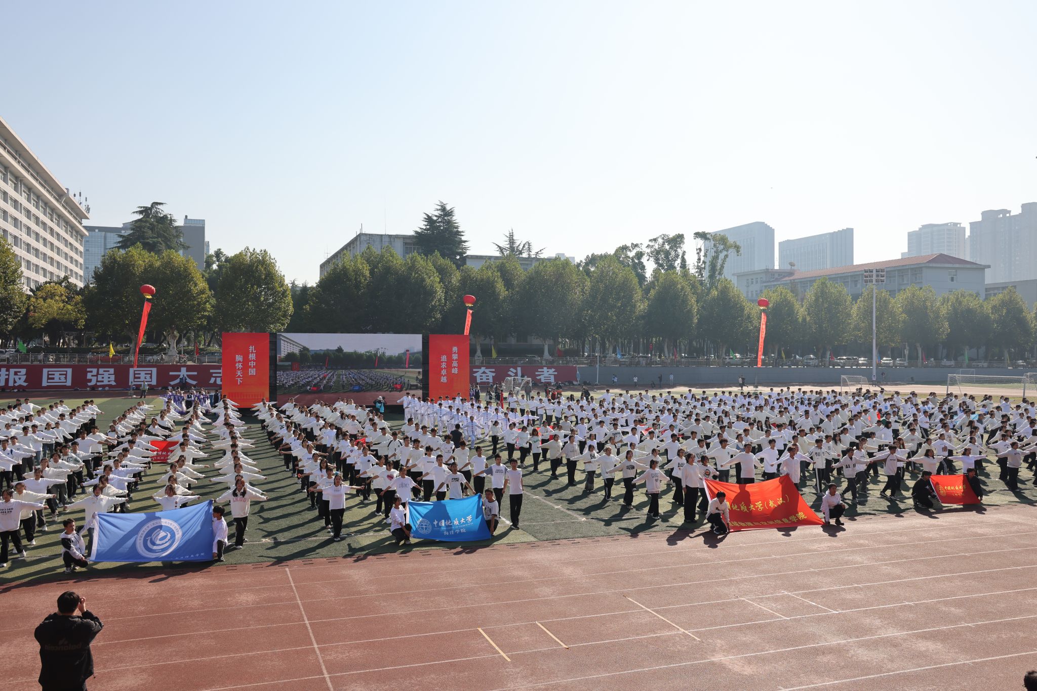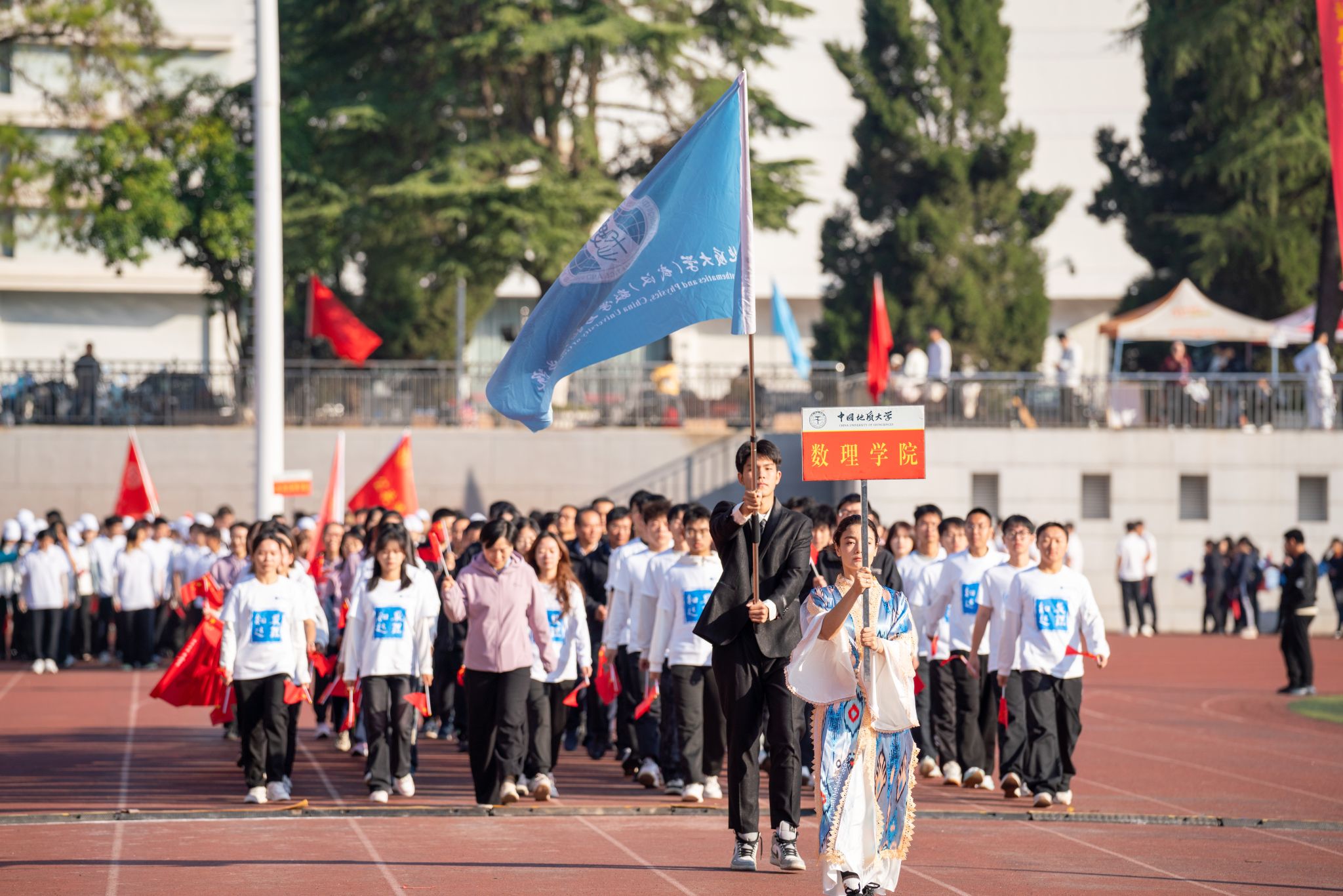 地大新闻网讯 呐喊与欢呼交织,动感与青春碰撞。运动场上旌旗飘扬,热闹非凡。10月25日,我校2024年秋季运动会在南望山校区西区运动场举行。校领导刘杰、王华、唐忠阳、王甫,党委常委、组织部部长陈文武,学校各二级单位负责人以及各分工会、各学院代表队参加开幕式。