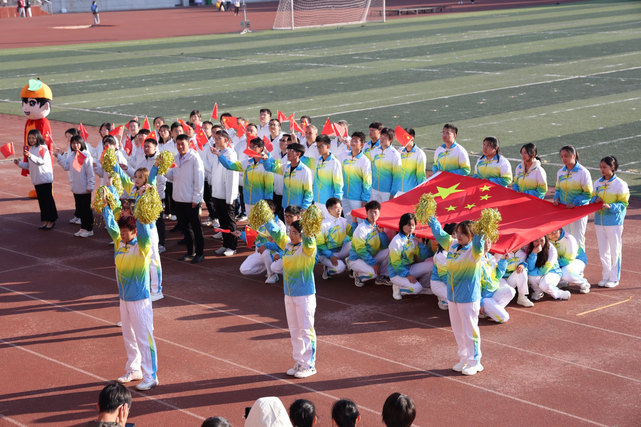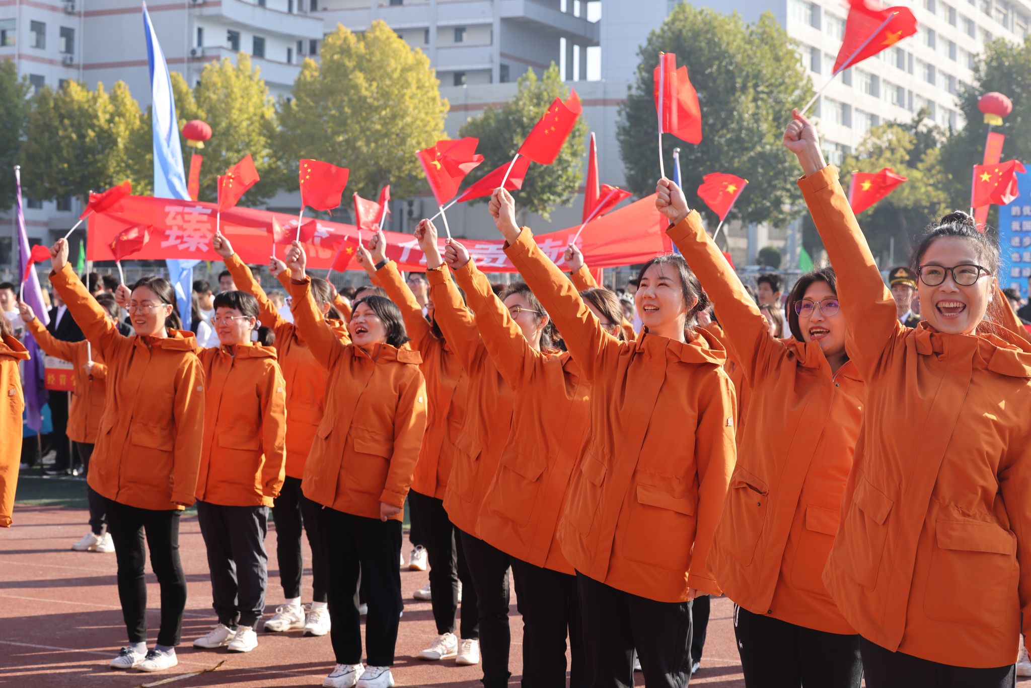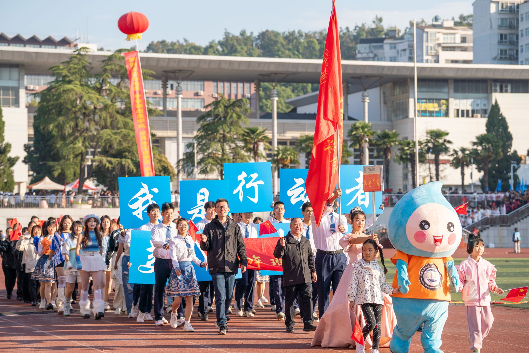 伴随着激昂的旋律,各方阵英姿飒爽、意气风发,迈着整齐的步伐,喊出响亮的口号,依次走过主席台。运动员们手中飘扬的红旗迎风飘扬,活力四射的玩偶、热情洋溢的舞姿赢得阵阵掌声。
