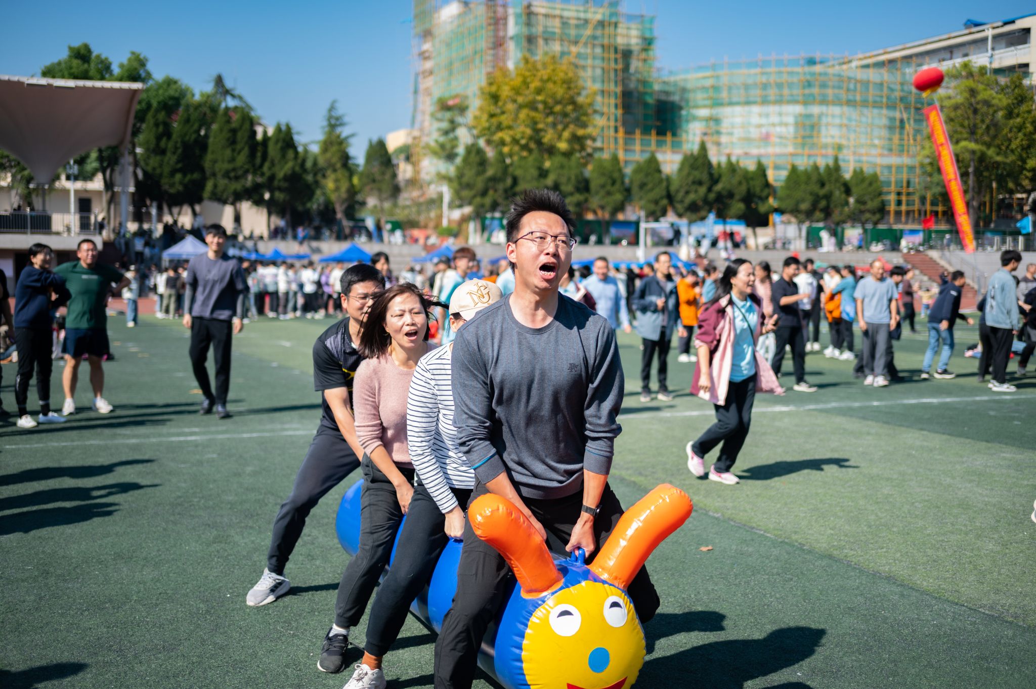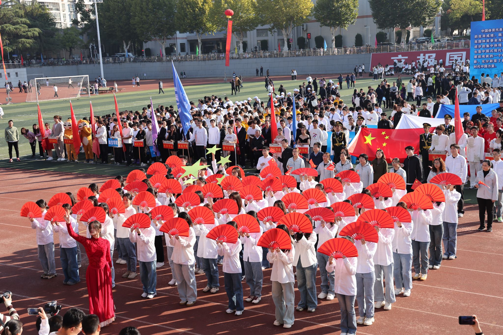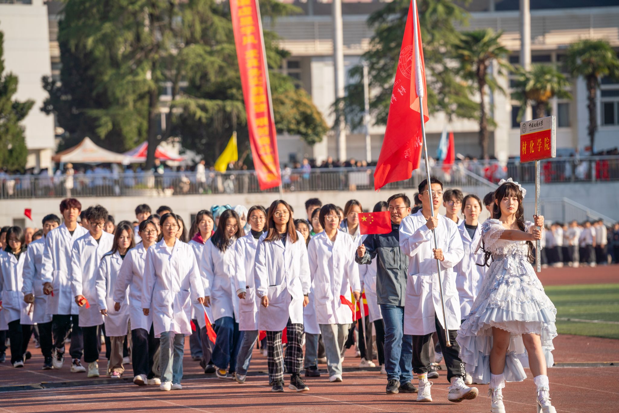 伴随着激昂的旋律,各方阵英姿飒爽、意气风发,迈着整齐的步伐,喊出响亮的口号,依次走过主席台。运动员们手中飘扬的红旗迎风飘扬,活力四射的玩偶、热情洋溢的舞姿赢得阵阵掌声。