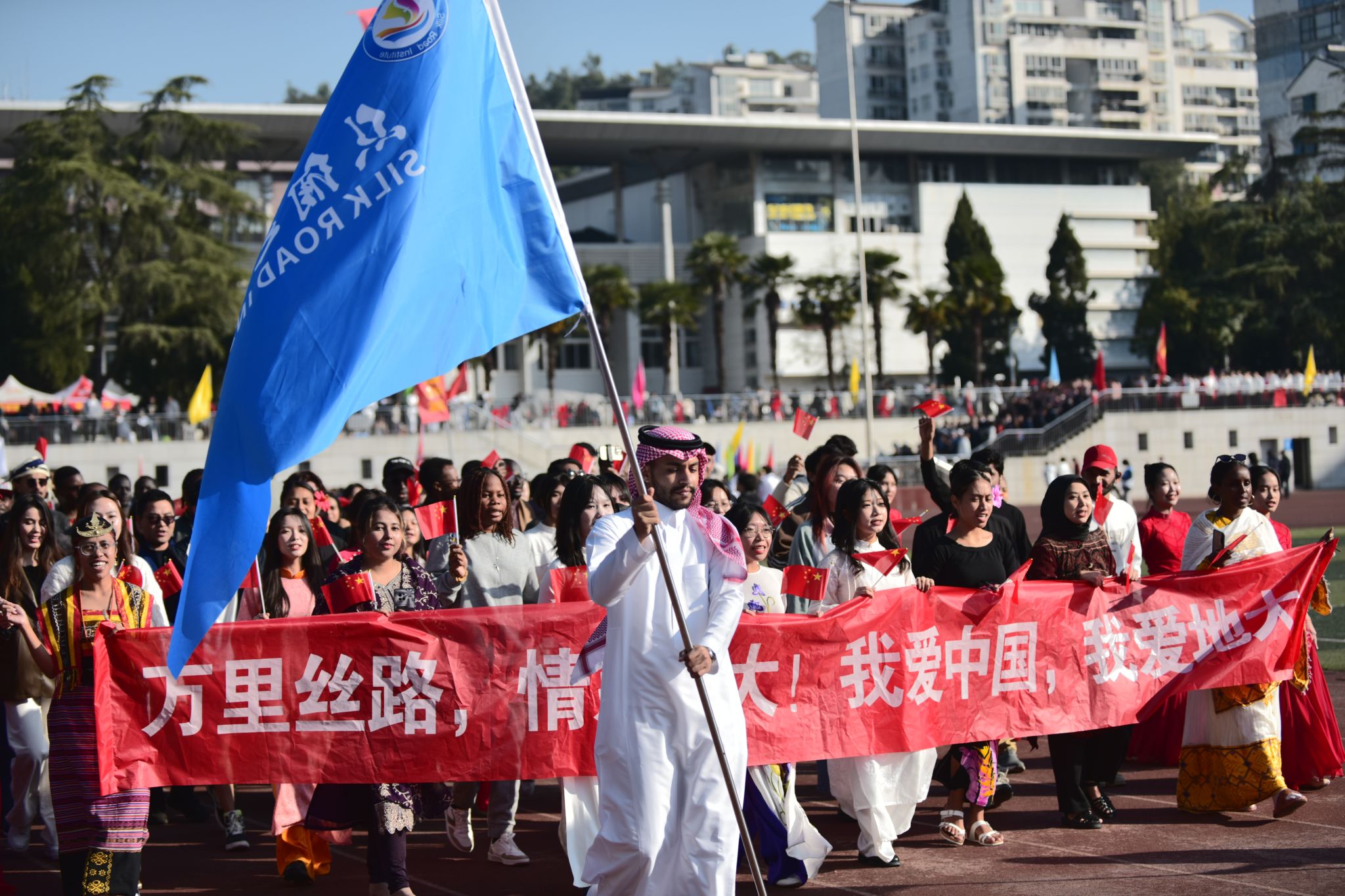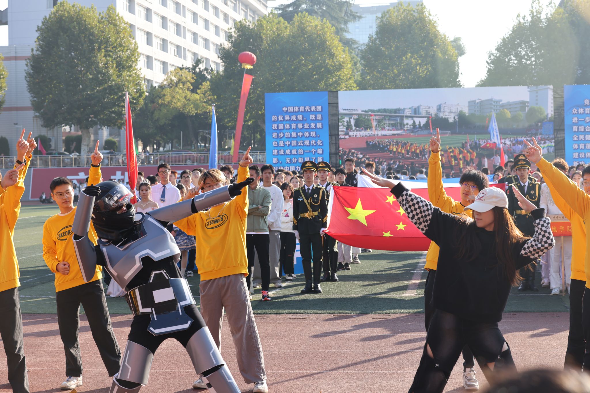 机械与电子信息学院方阵一支机械舞,将学院的学科特色与舞蹈艺术巧妙融合,展现出了独特的魅力;体育学院带来一套拳法,刚柔相济,行云流水,弘扬博大精深的中国武术;国际教育学院的外国友人身着各自国家的特色服饰,大声喊出“我爱地大”,传递出国际文化交流的友好与融合。