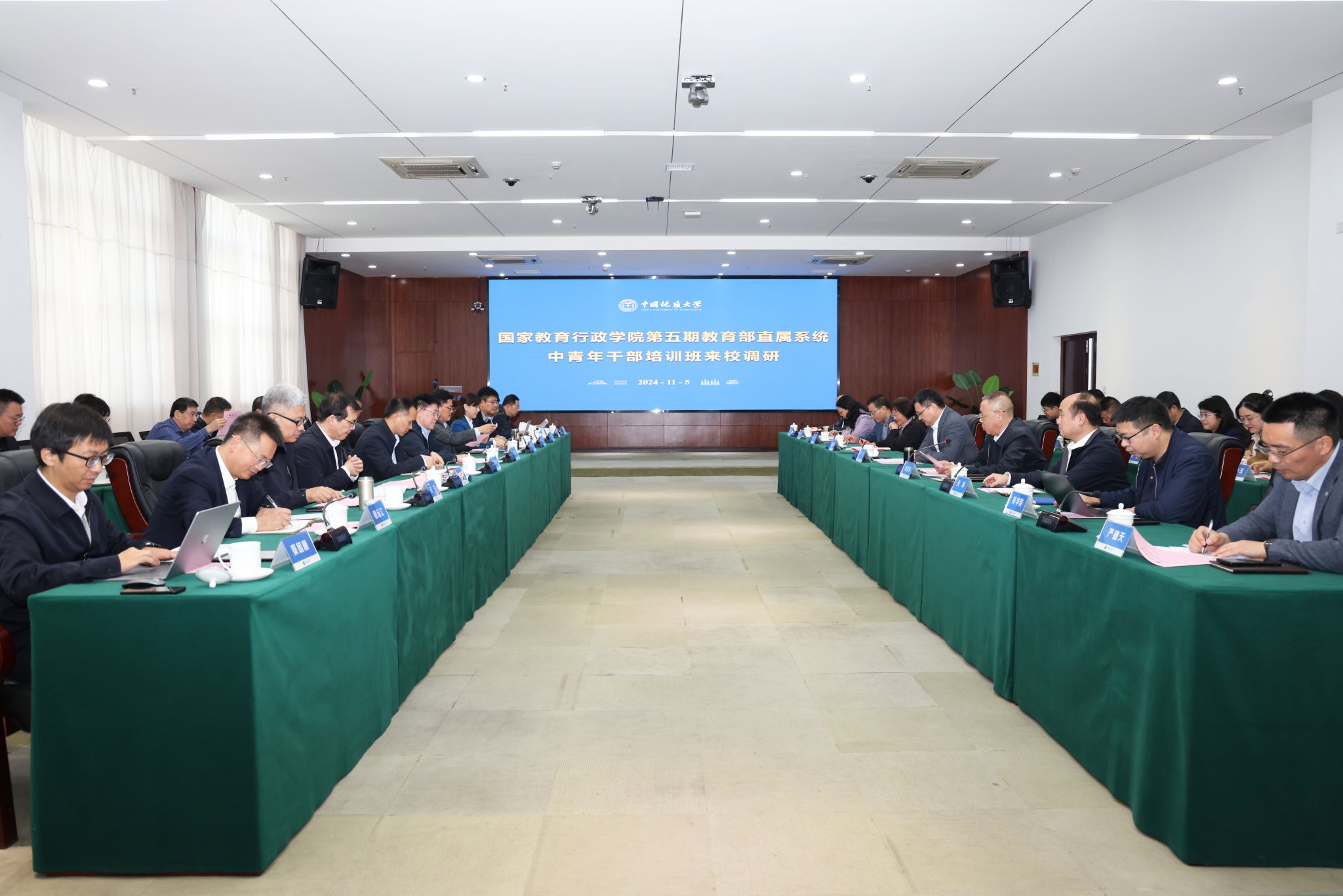 地大新闻网讯 (记者 孙彦钦)11月5日,国家教育行政学院第五期教育部直属系统中青年干部培训班来校调研,并围绕“高校打造办学特色与优势学科的创新实践”开展座谈。校党委书记刘杰,党委副书记、纪委书记唐忠阳,党委常委、党委组织部部长、党委统战部部长陈文武,相关部门负责人参加调研座谈。