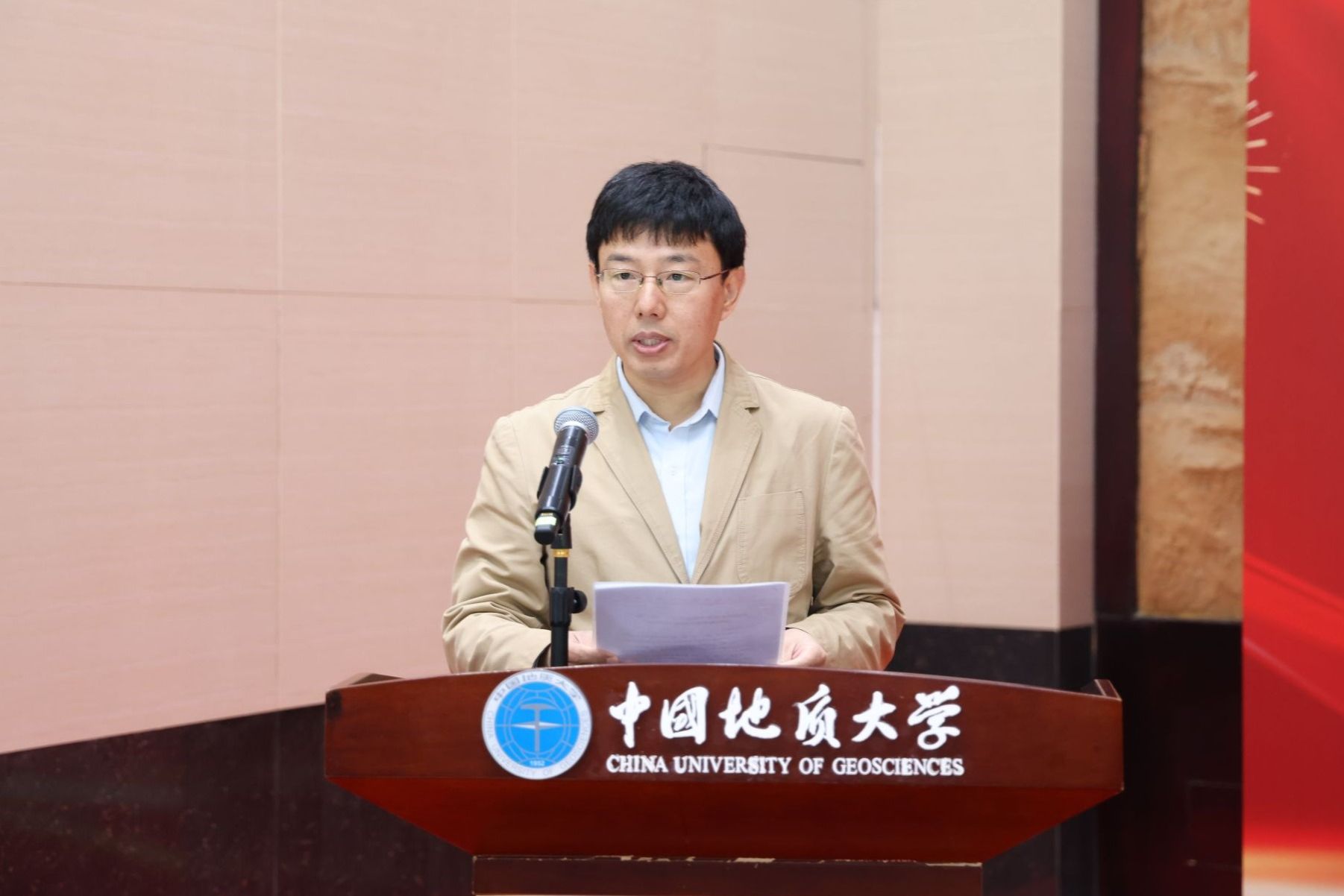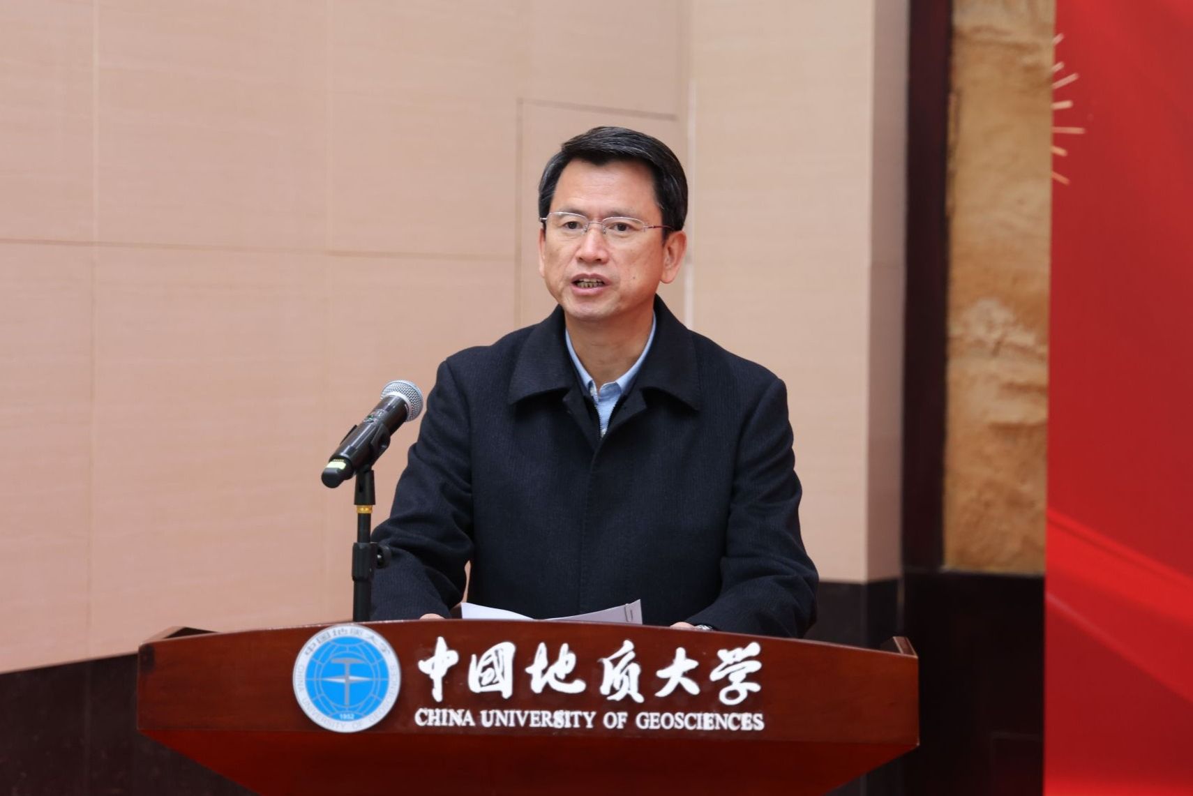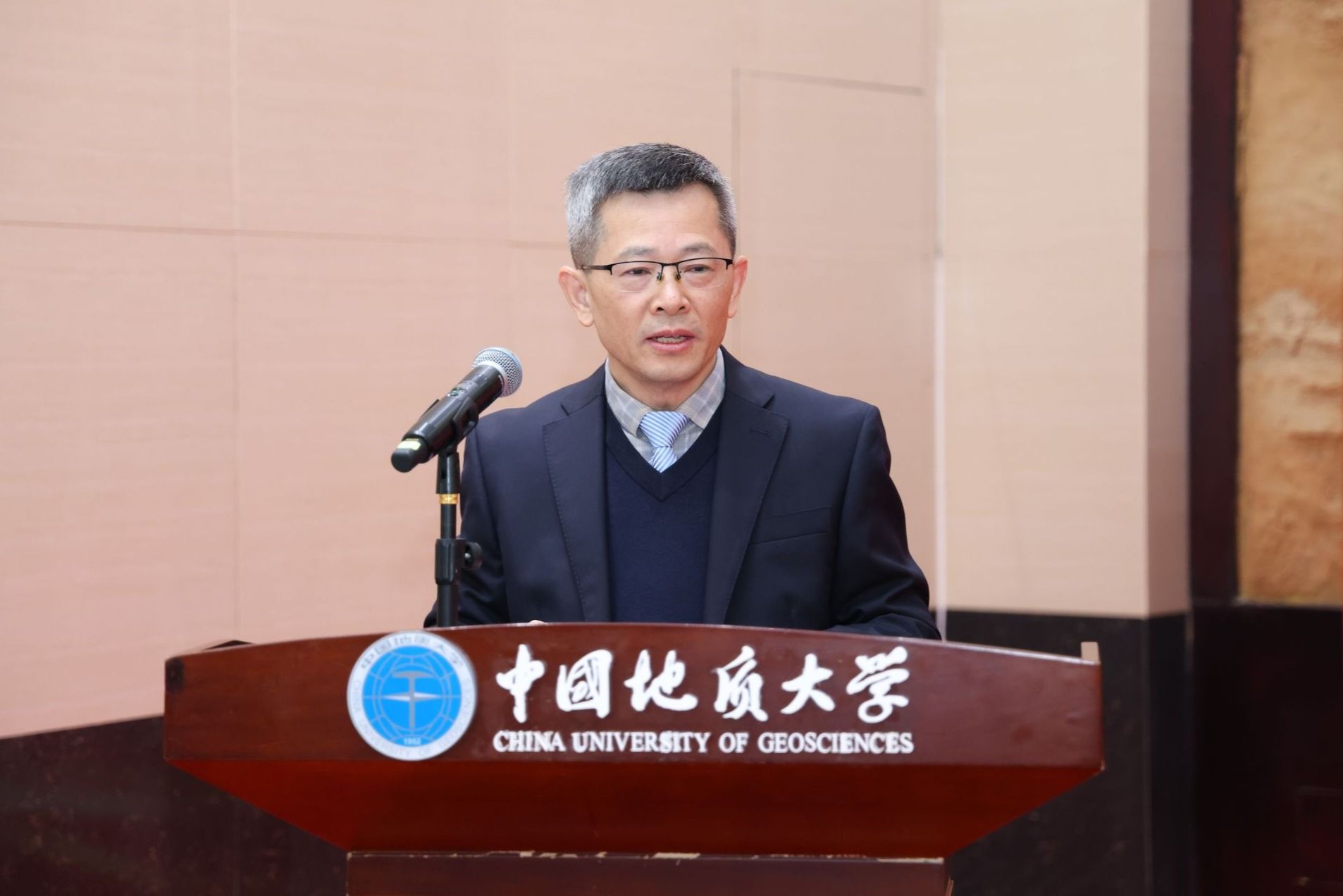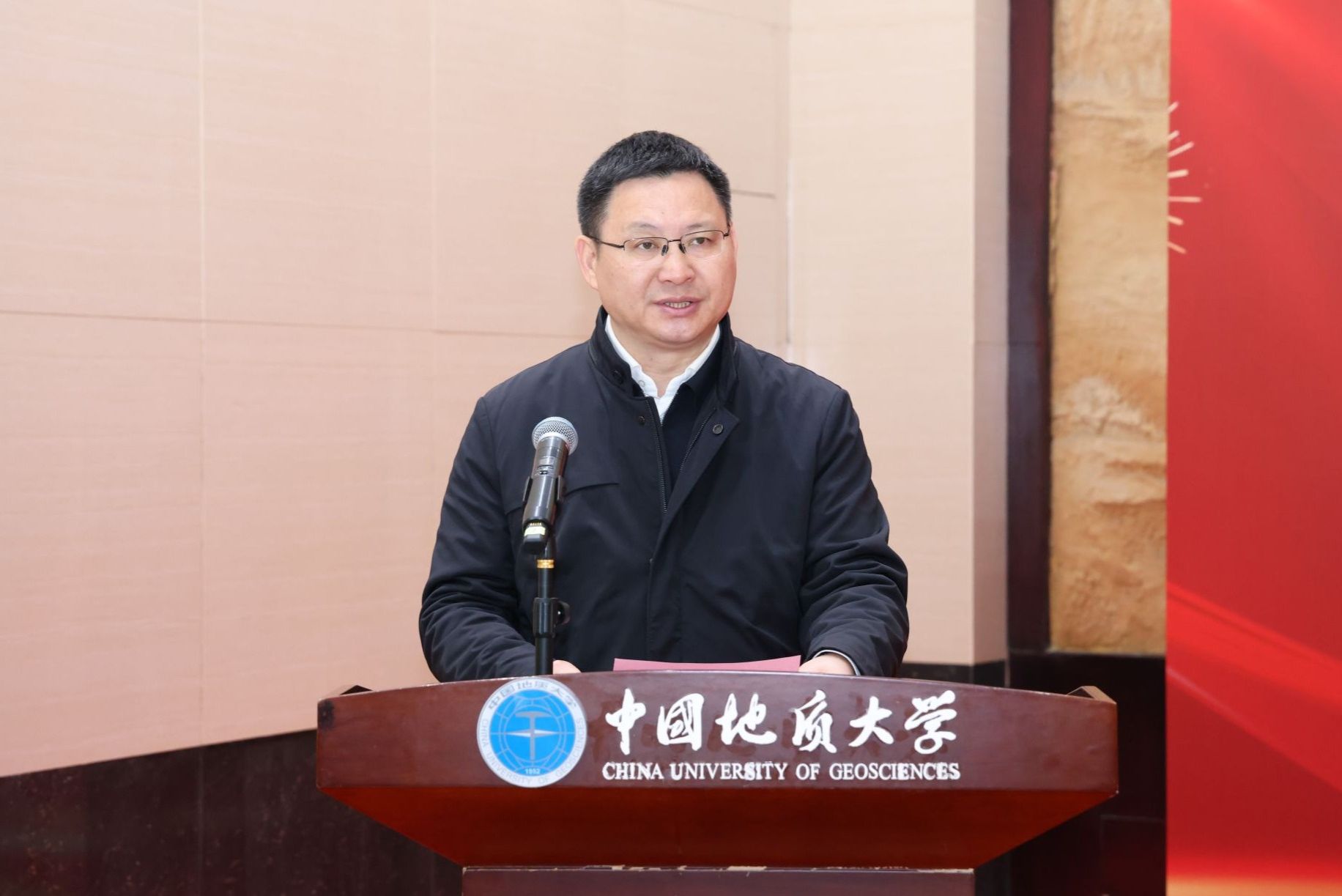 李建威致辞。他表示,“中心”的揭牌成立,是我校与中国地质调查局深化战略合作的又一重要举措,标志着双方在共同服务国家重大战略上迈向了新的高度。作为地球科学领域的高等教育国家队和中国政府奖学金项目招收地矿类专业留学生最重要的人才培养基地,学校已为100多个国家培养出近万名知华友华的高素质国际化人才,其中共建“一带一路”国家学生占比80%。学校将与中国地质调查局携手聚力,着力将“中心”打造为一流的国际化人才培养中心,为谋求人与自然和谐共生、构建人类命运共同体贡献地大智慧和地大力量。