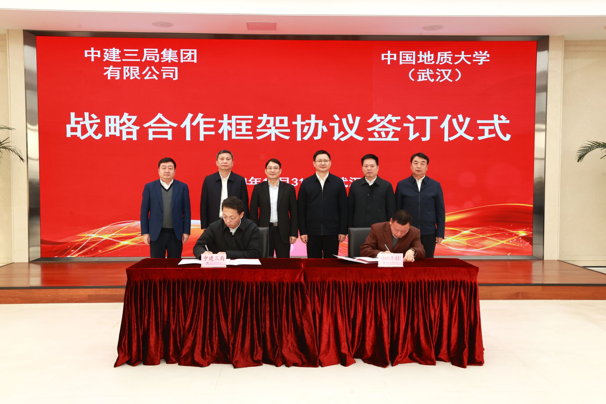 地大新闻网讯(通讯员 霍少孟)12月31日,我校与中建三局集团有限公司(以下简称“中建三局”)举行战略合作框架协议签订仪式。校党委书记刘杰,校党委副书记王林清,副校长胡守庚、王文起,中建三局党委书记、董事长陈卫国,副总经理、总工程师侯玉杰,副总经理夏元元参加签约仪式。王林清、侯玉杰代表双方签订战略合作框架协议。