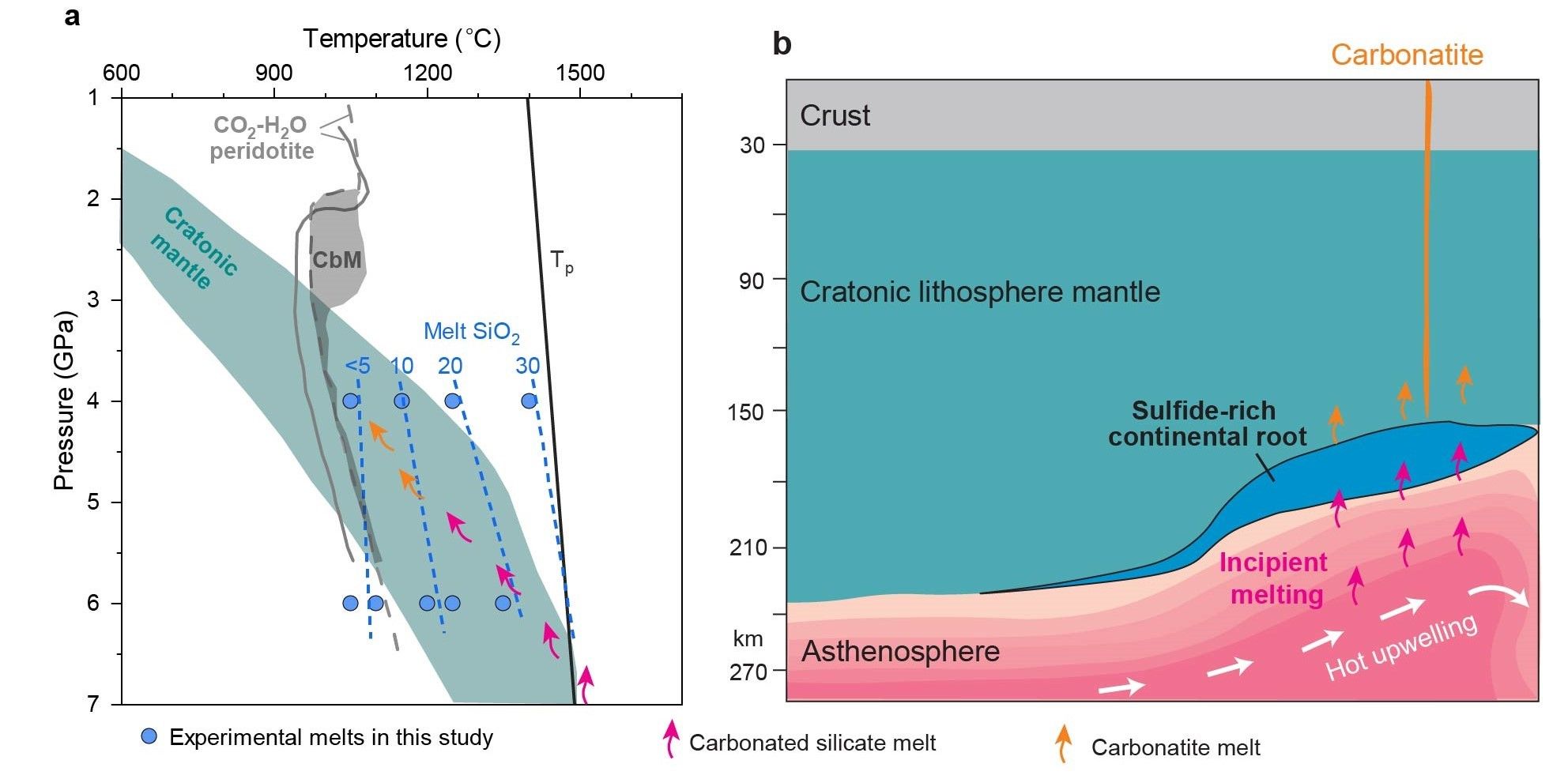 起源于克拉通之下、深部地幔的初始岩浆,富含碳酸盐成分,向上迁移时会横向流动至边缘区域,从而导致岩石圈厚度相对较小的边缘地区火山活动频繁。该论文通过高温高压实验模拟了这种边缘岩浆的演化过程,发现当富含碳酸盐岩浆从克拉通下方向上迁移时,其中的硅酸盐成分发生沉淀,导致岩浆中的硅逐渐被去除,最终转变为几乎纯的碳酸盐岩浆,即火成碳酸岩。当岩浆中的硅酸盐发生沉淀时,其中蕴含的金属和硫元素也以硫化物的形式从岩浆中沉淀出来,最终在克拉通边缘形成金属和硫的异常富集带,即具有硫化物富集特征的大陆根。