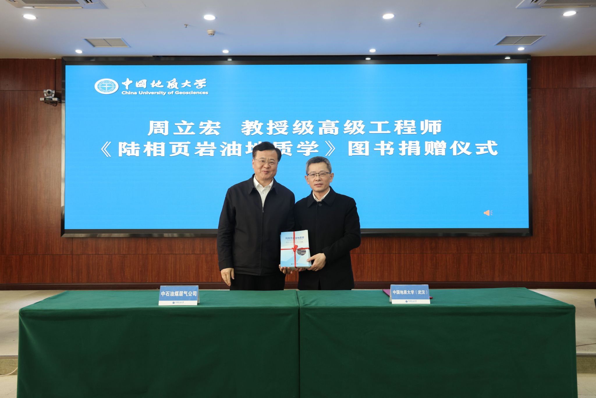周立宏向我校捐赠《陆相页岩油地质学》图书。