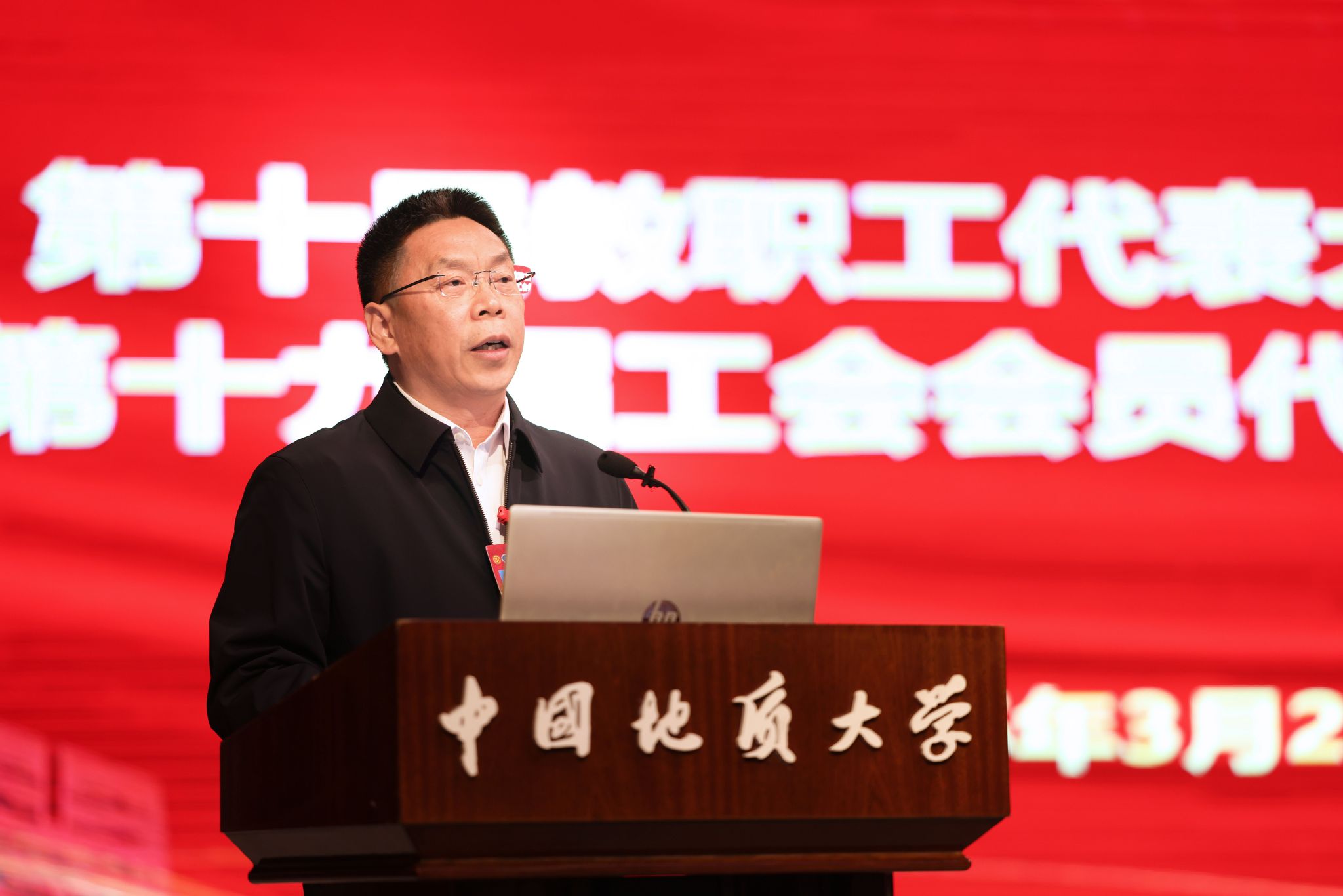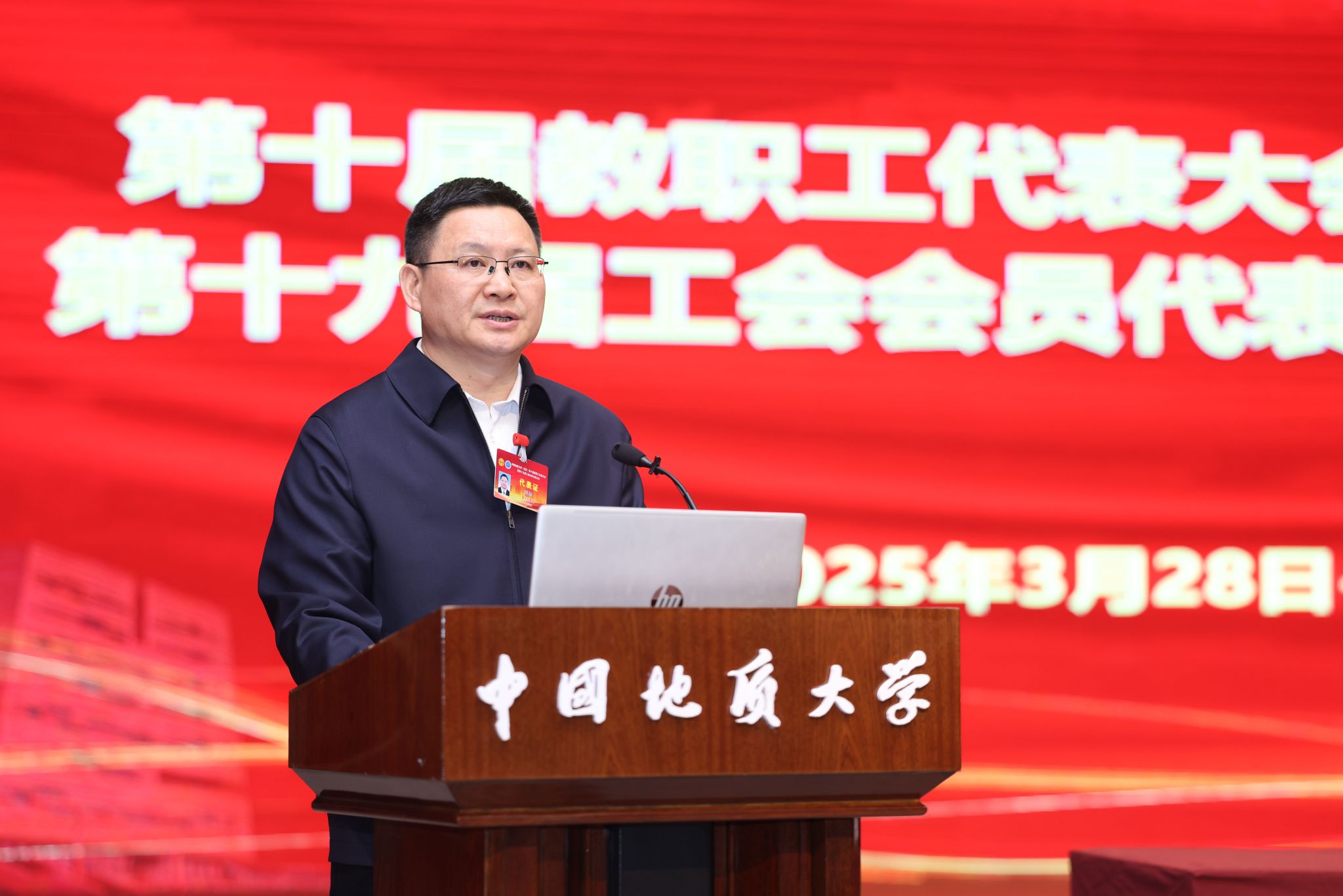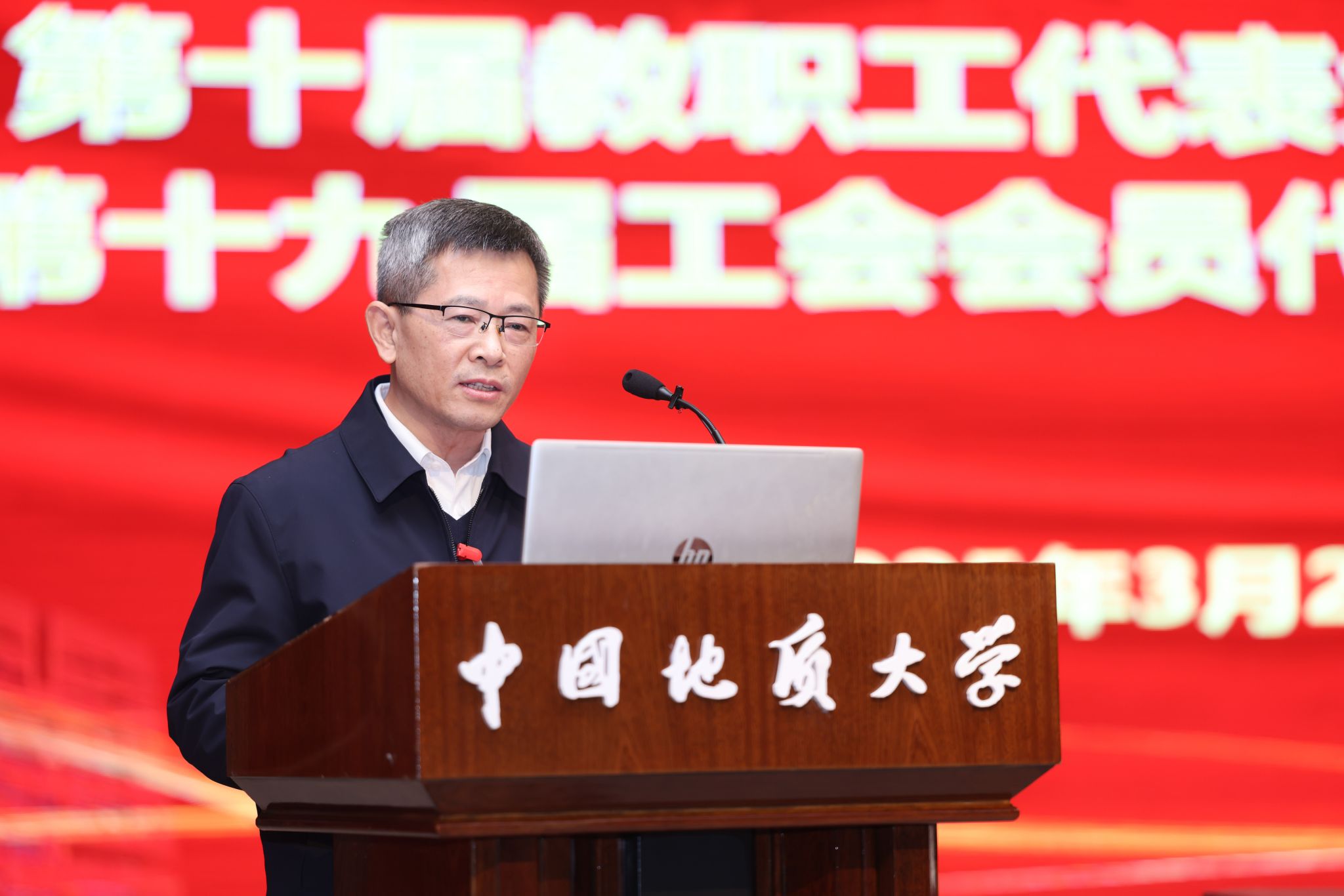校党委副书记、工会主席王甫作教代会、工代会工作报告。他回顾了2024年的主要工作,强调2025年要在学校党委和上级工会的领导下,紧紧围绕学校“深化改革年”目标任务,充分发挥组织优势和桥梁纽带作用,着力实现思想引领有成效、民主建设有作为、职工群众有收获、工会组织有活力、服务大局有贡献,团结动员全体教职工为全面推进教育强国建设地大实践努力奋斗。