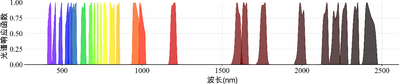 “地质一号”卫星围绕地质资源环境要素探测与识别需求,在可见-近红外(VNIR,410–1000nm)与短波红外(SWIR,1000–2480nm)波长范围内分别优化配置了16个及10个谱段。可见-近红外波长范围内,主要针对水、土、矿、植被等几大要素的探测,实现不同地质环境要素的精细光谱监测。在短波红外波长范围内,“地质一号”强化了地质行业光谱谱段的信息获取能力,特别是针对典型地质矿物在特定波长范围内的显著光谱特征,提升了对矿物组分、岩性类型、矿山环境等地质矿产领域的深层次信息获取能力。“地质一号”的光谱配置充分结合地质资源环境要素的光谱响应机制,为地质环境监测、矿产资源分类与成矿靶区预测等应用场景提供了高精度、高可靠性的遥感数据支撑。