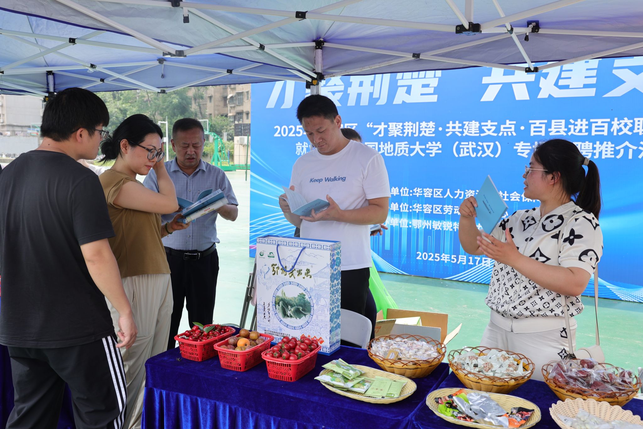 鄂州市华容区设置了特色糕点以及农产品展示区,吸引了大量学生前来围观品尝。