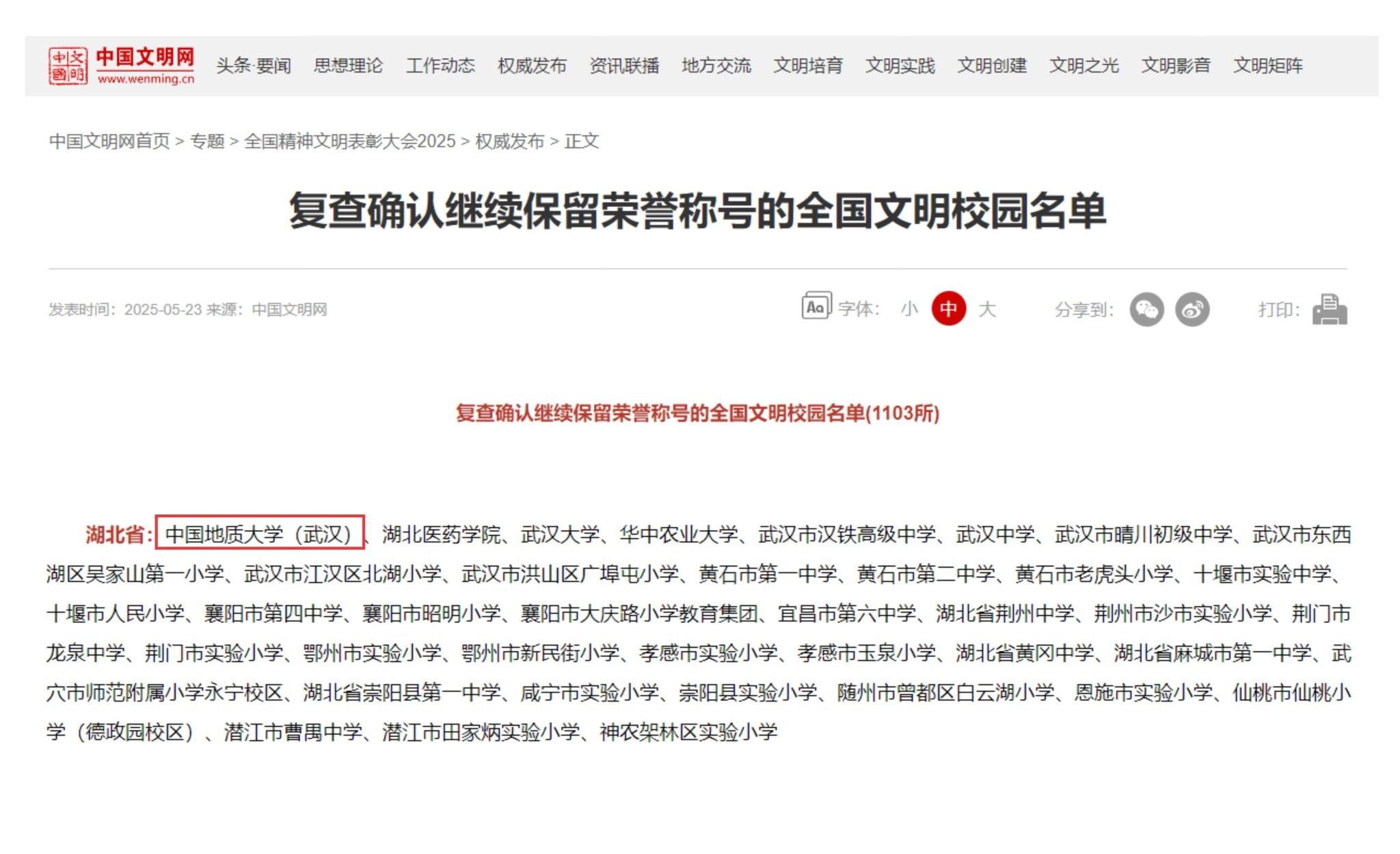 地大新闻网讯(记者 王诲 吴仁喜)5月23日,中央宣传思想文化工作领导小组发布《关于复查确认继续保留荣誉称号的全国文明城市、文明村镇、文明单位、文明家庭、文明校园的通报》,我校顺利通过复查,蝉联“全国文明校园”荣誉称号。