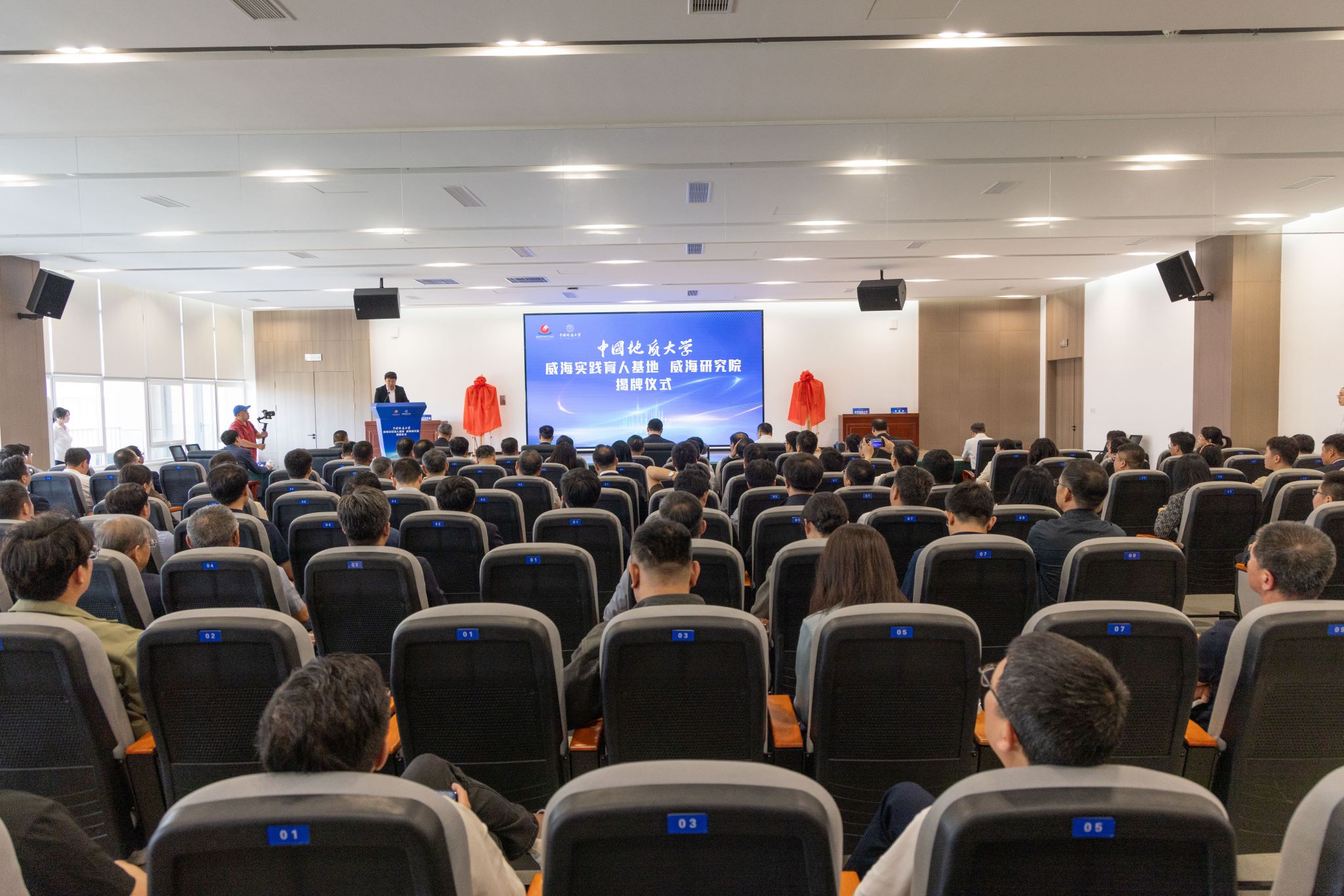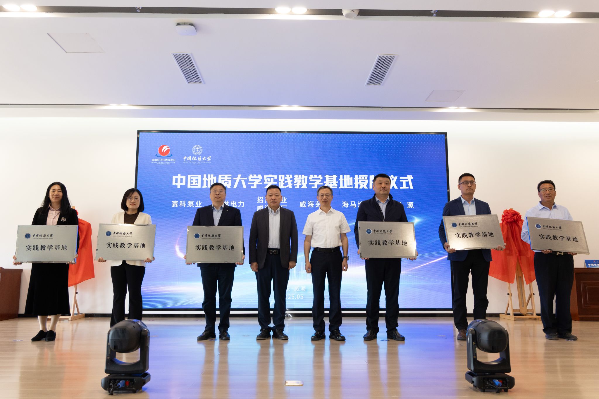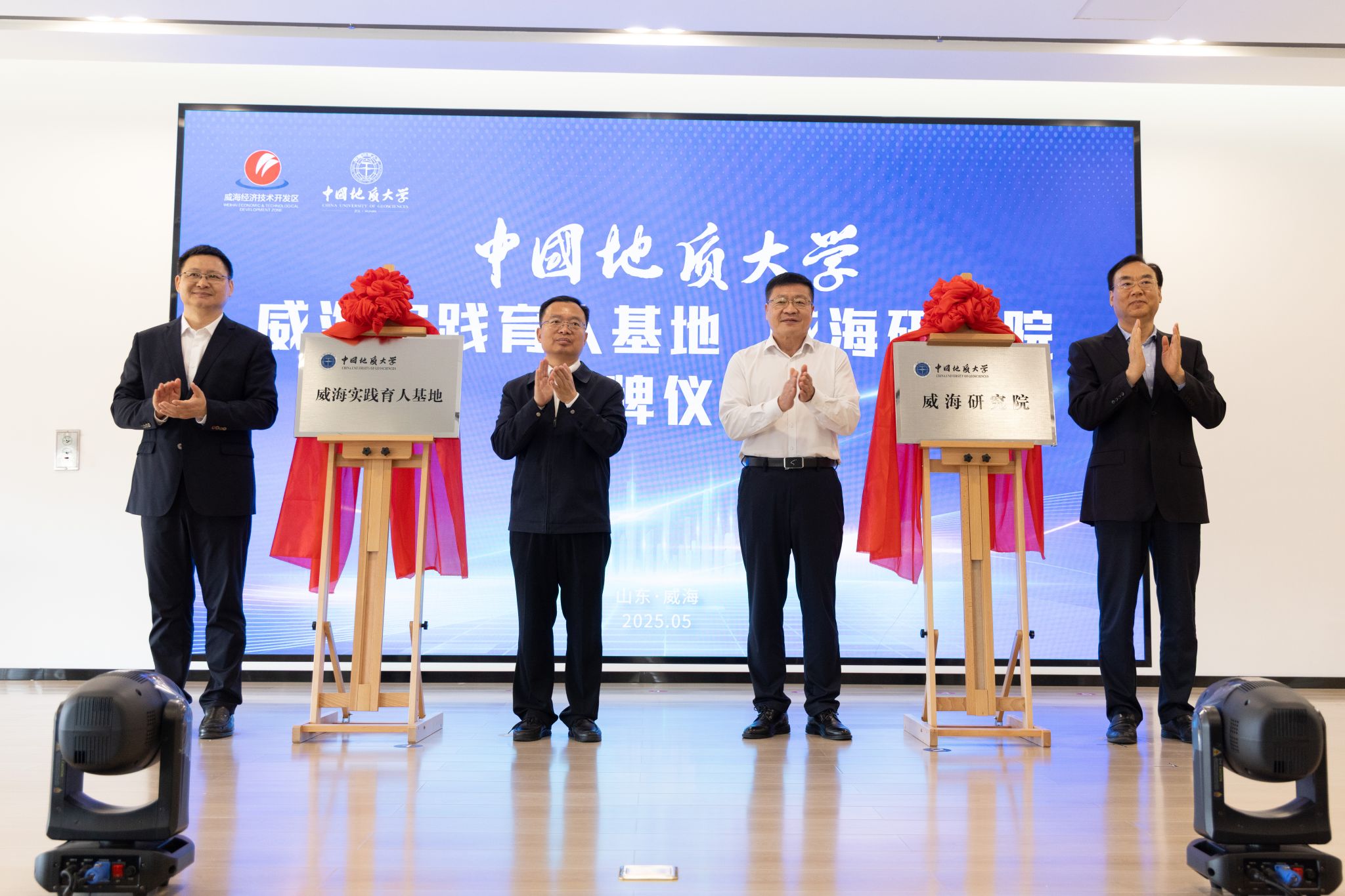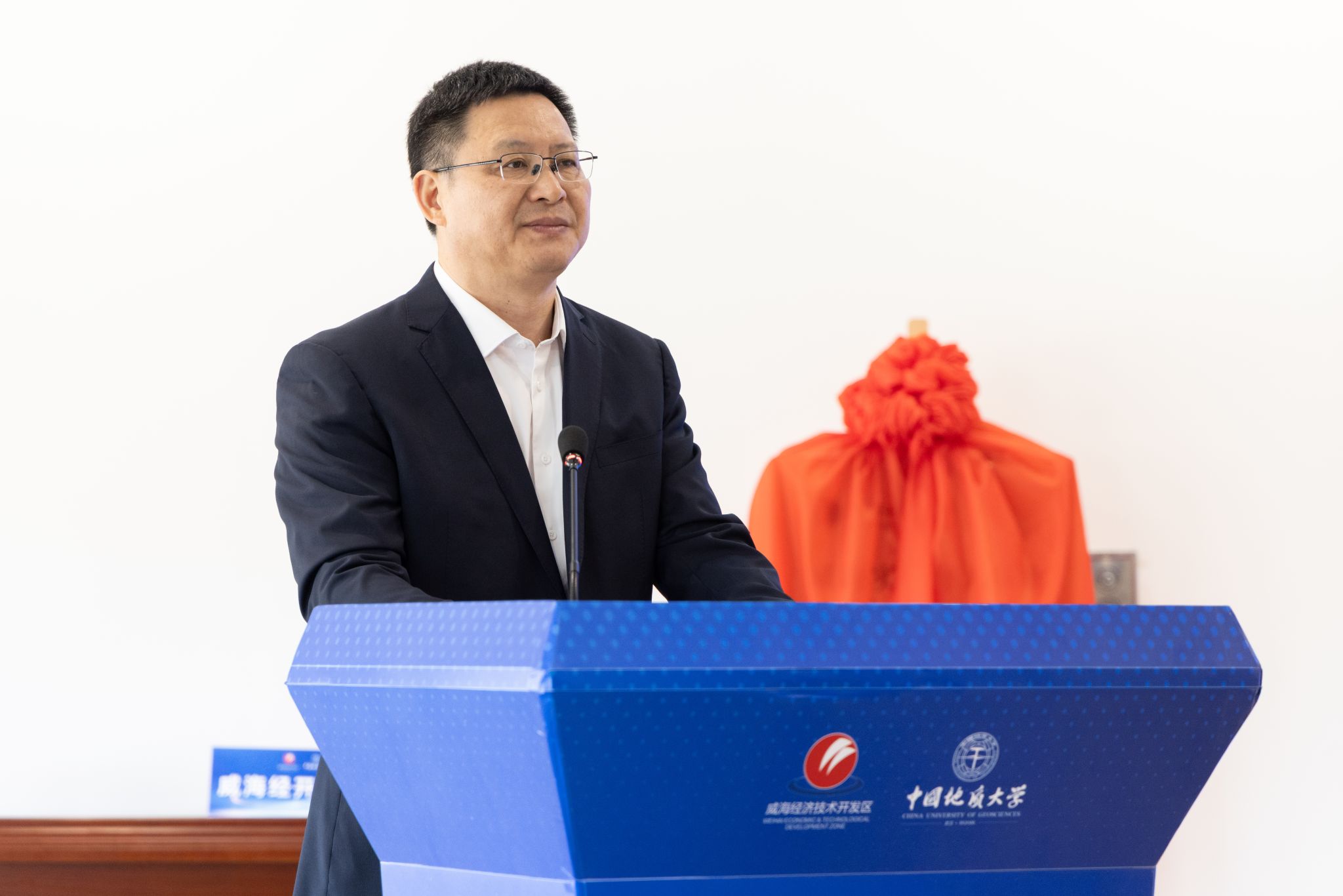 我校党委书记刘杰,山东省地质矿产勘查开发局二级巡视员韩志森,威海市委常委、组织部部长、统战部部长刘裕斌,威海经济技术开发区党工委书记、管委会主任王清等领导共同为威海实践育人基地和威海研究院揭牌。