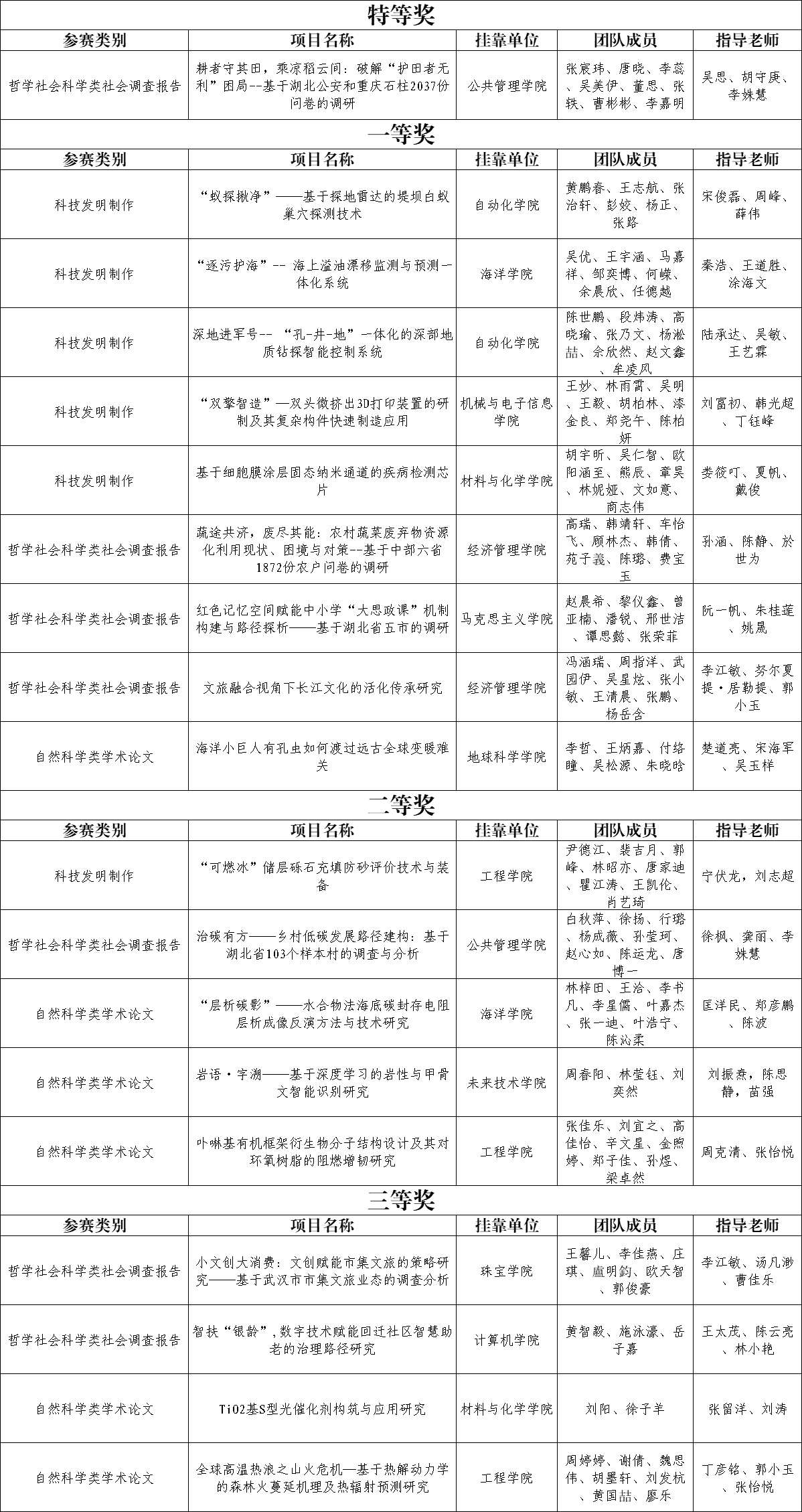 湖北省第十五届“挑战杯”大学生课外学术科技作品竞赛获奖名单一览表