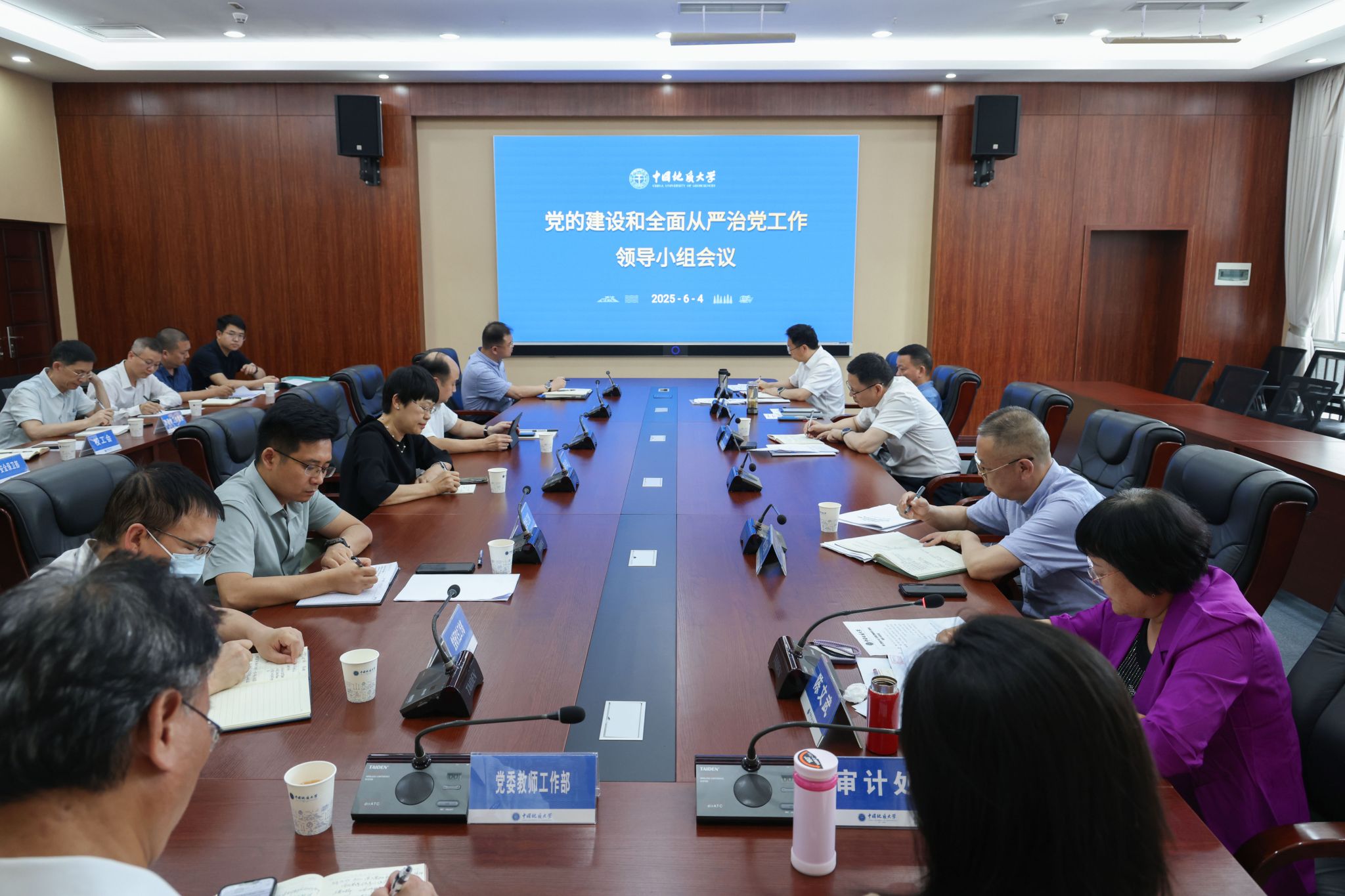地大新闻网讯(通讯员 李海涵 摄影 李锐欣)6月4日,我校召开党的建设和全面从严治党工作领导小组工作会议,深入学习领会习近平总书记重要讲话精神和重要指示精神,研究推进深入贯彻中央八项规定精神学习教育,对下一步学习教育进行再动员、再部署、再推进。校党委书记刘杰,副书记王林清、唐忠阳、王甫,学校党的建设和全面从严治党工作领导小组成员单位主要负责同志参会。王甫主持会议。