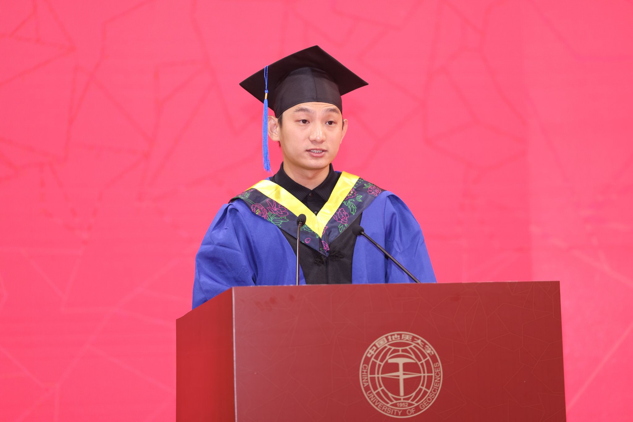 毕业留学生代表、地球物理与空间信息学院苏丹籍博士研究生路兵同学发言。作为中国为苏丹培养的首位地球物理反演博士,他的研究成功解决了苏丹油田难题。他说,在地大的11年,不仅收获了“上天入地”的专业本领,更练就了“不服周”的精神。“地大是根,中国是帆。”他将带着母校的烙印和中国的厚爱,奔赴星辰大海。