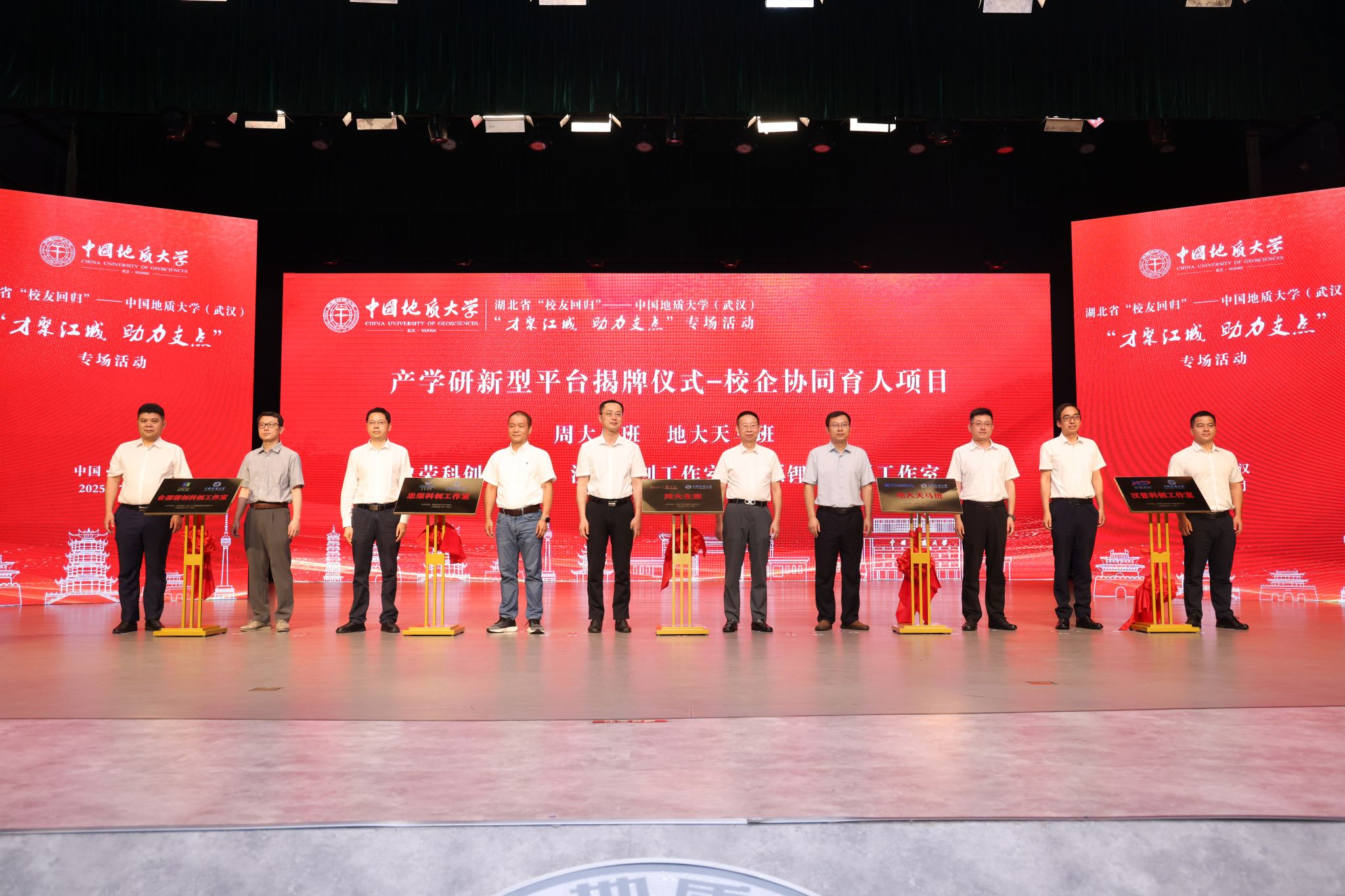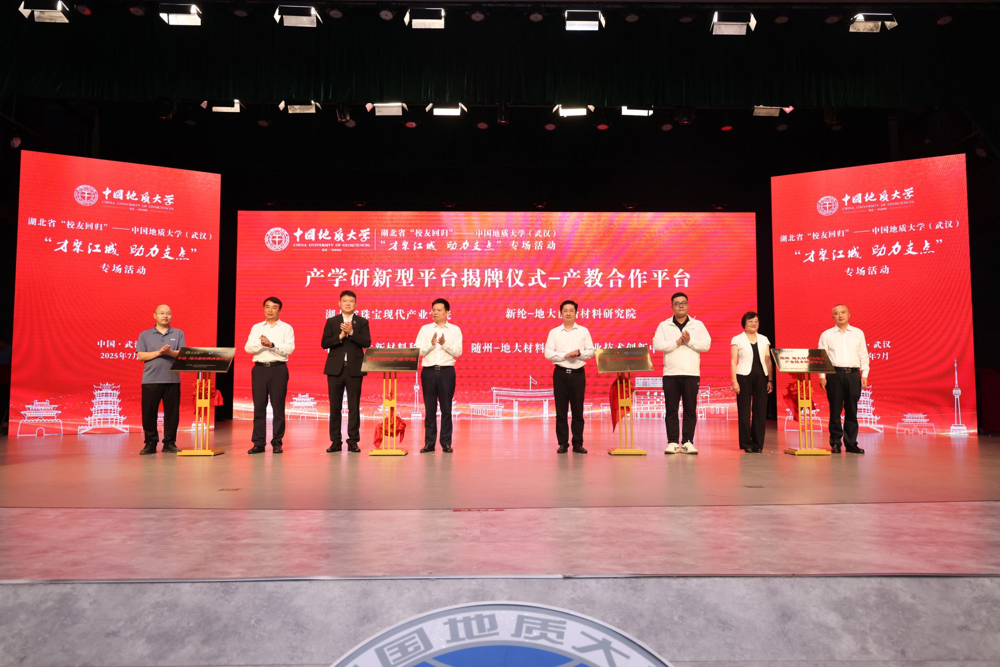 湖北省珠宝现代产业学院、新纶-地大前沿材料研究院、申昙-地大新材料科创中心、随州-地大材料与化工产业技术创新中心四个产教合作平台及“周大生班”“地大天马班”“忠荣科创工作室”“汉普科创工作室”“合源锂创科创工作室”五个校企协同育人项目揭牌。