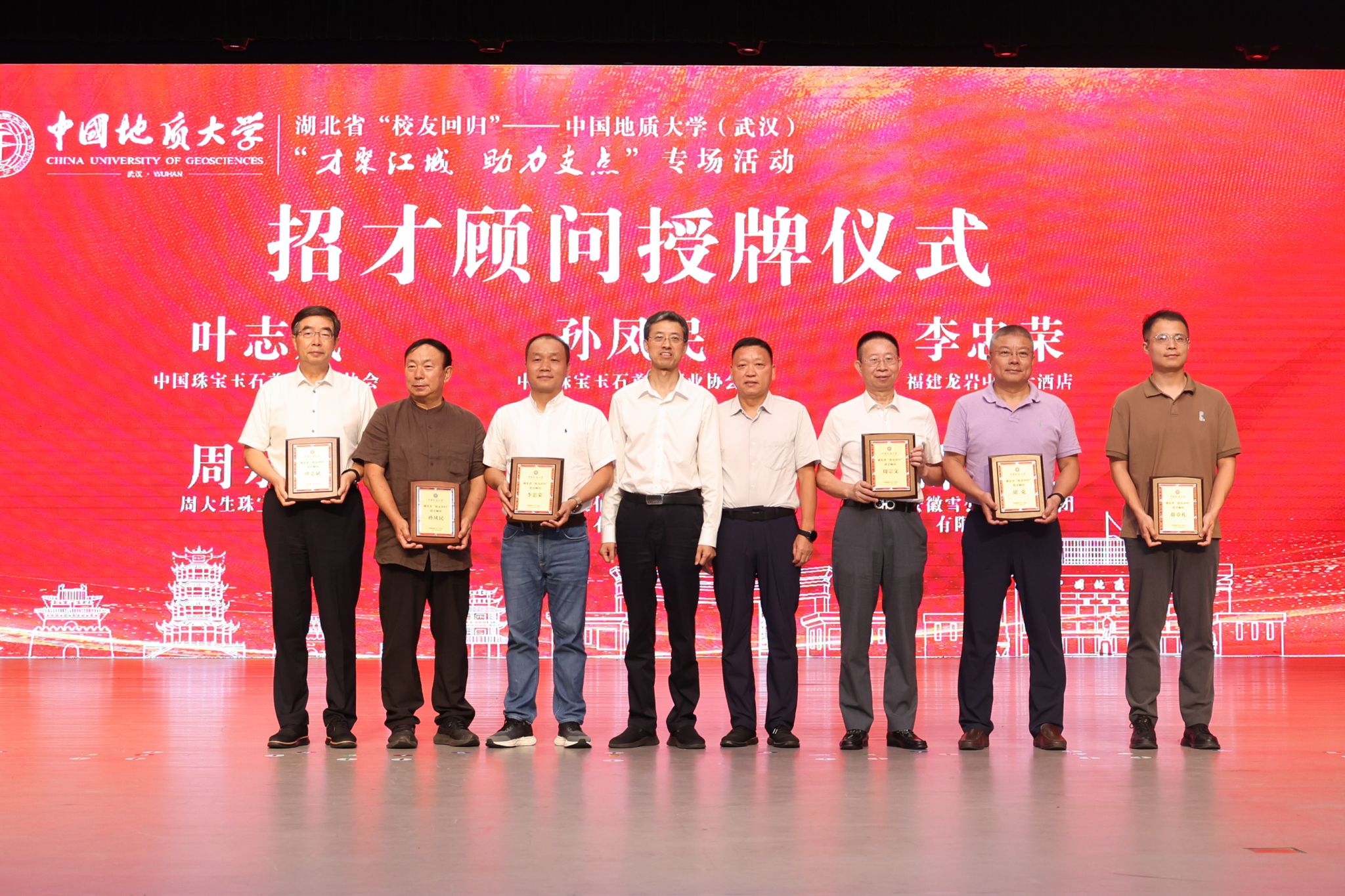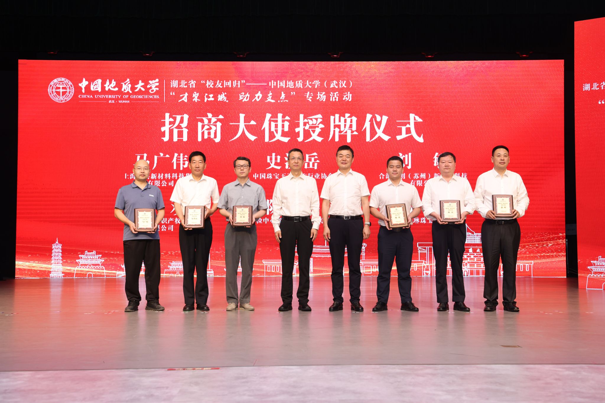 现场举行湖北省“校友回归”招商顾问、招才大使聘任仪式,12位知名校友企业家接受聘书。
