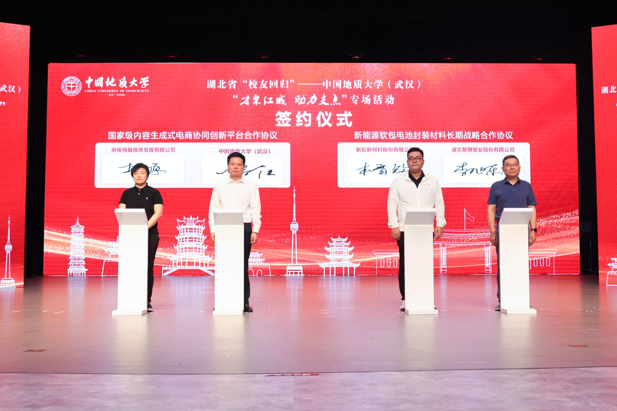 现场举行签约仪式。央视频融媒体发展有限公司与我校签订“国家级内容生成式电商协同创新平台”合作协议;新纶新材料股份有限公司与湖北慧狮塑业股份有限公司签订“新能源软包电池封装材料长期战略合作协议”。