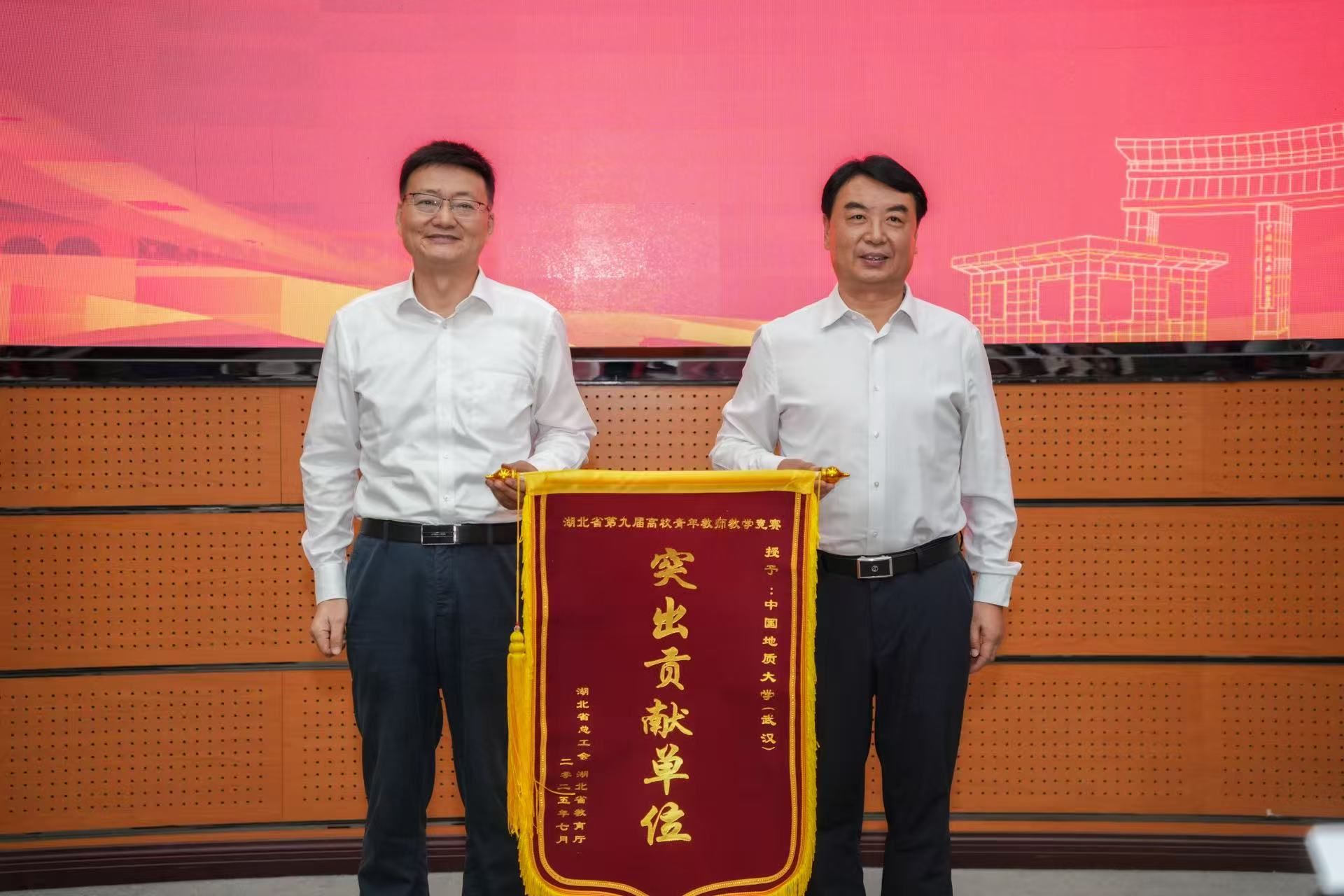 作为赛事协办方,我校被授予“突出贡献单位”。湖北省总工会党组成员、经审委员会主任汪胜全向我校授旗。