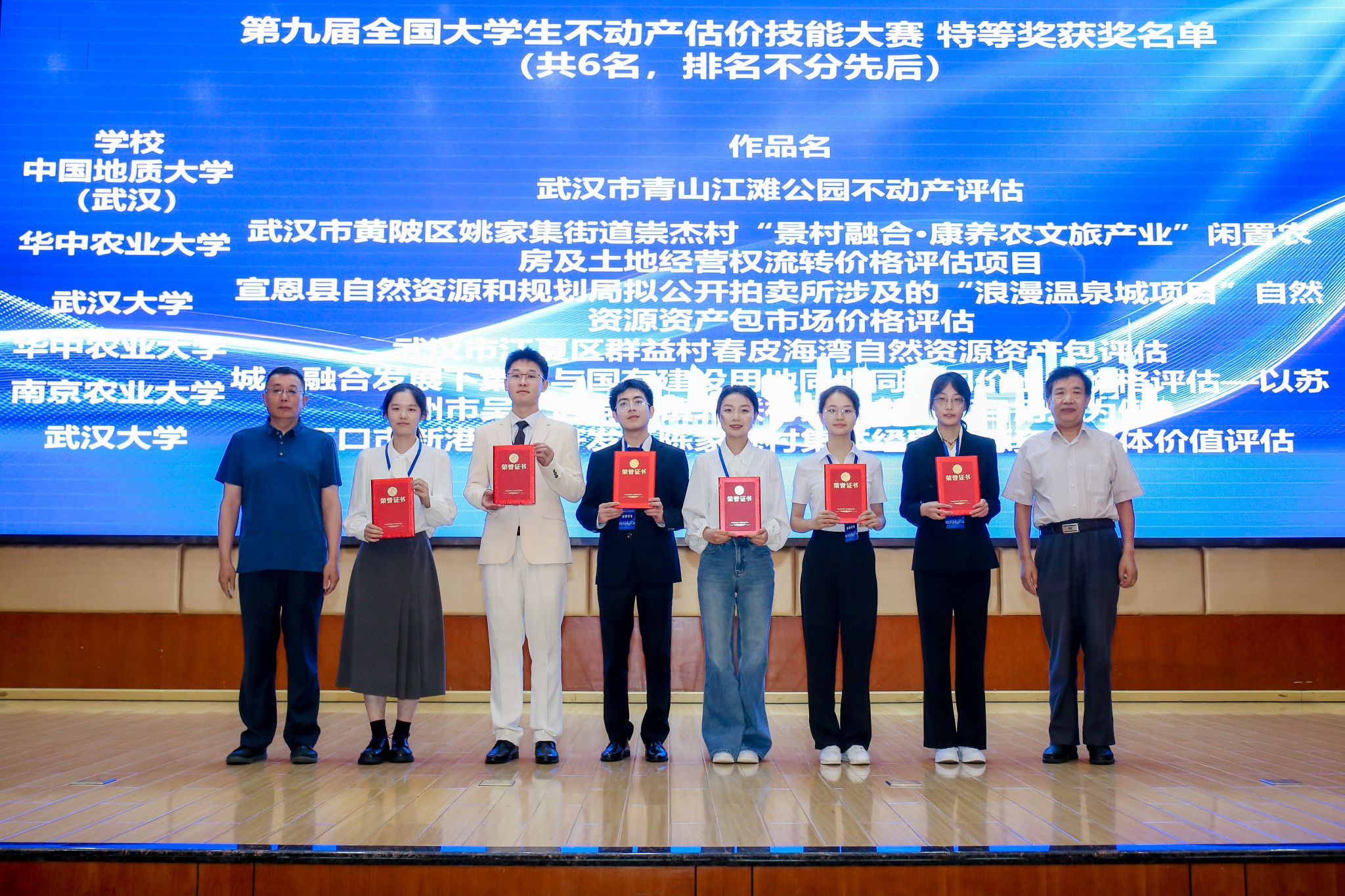 我校公共管理学院经过为期三个月的选拔、培育、备赛,遴选出两支队伍报送作品参赛,最终由徐枫教授、龚健教授指导,行璐、杨成薇、罗鑫、陈运龙组成的学生团队以《武汉市青山江滩公园不动产价值评估》为题的作品获得全国特等奖;由汪樱副研究员、李晶晶教授指导,边宇佳、宋之豪、隋粮屿、刘芳菲组成的学生团队以《武汉市东湖吹笛景区森林生态价值与经济价值评估》为题的作品获得全国三等奖。