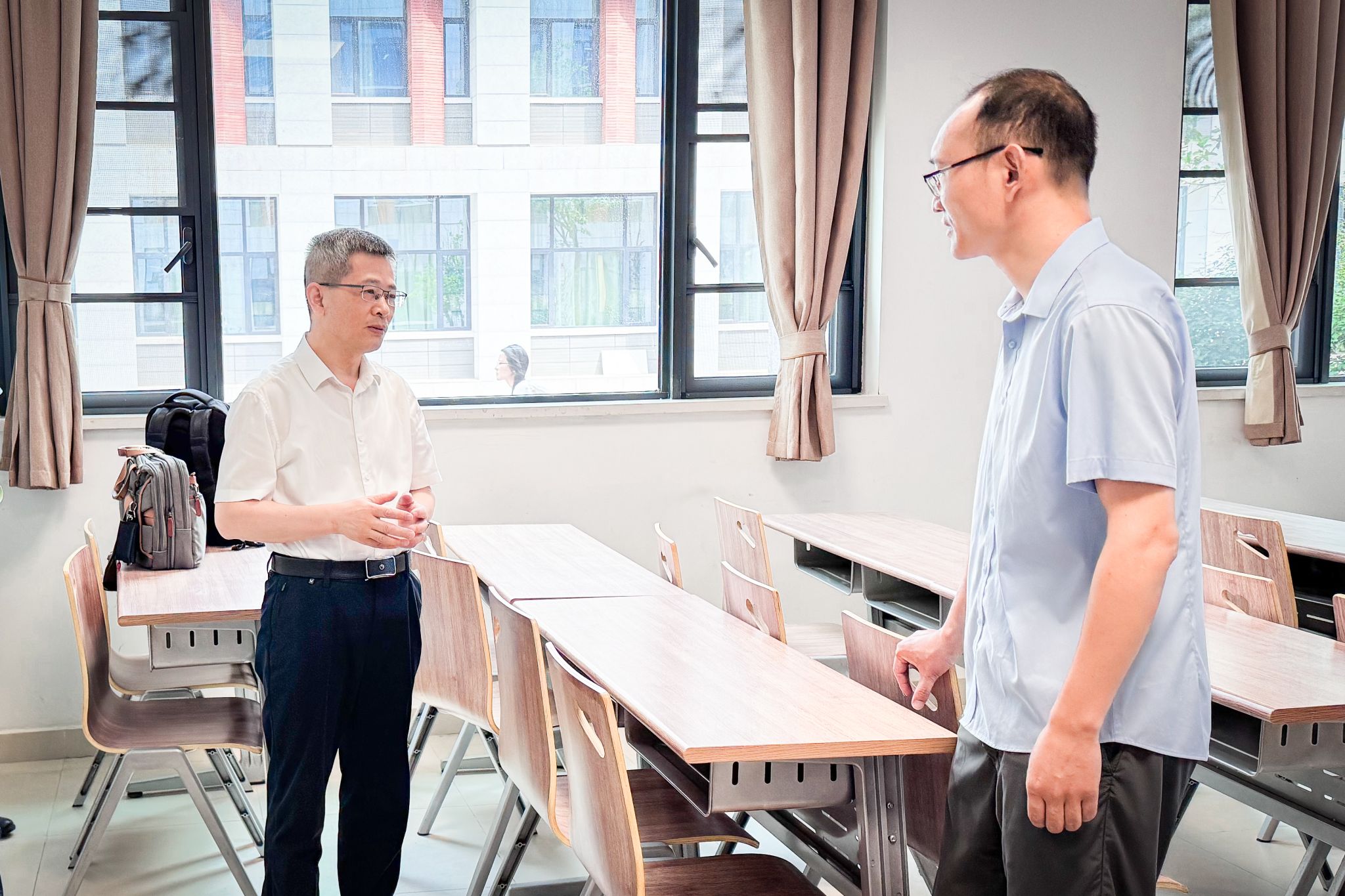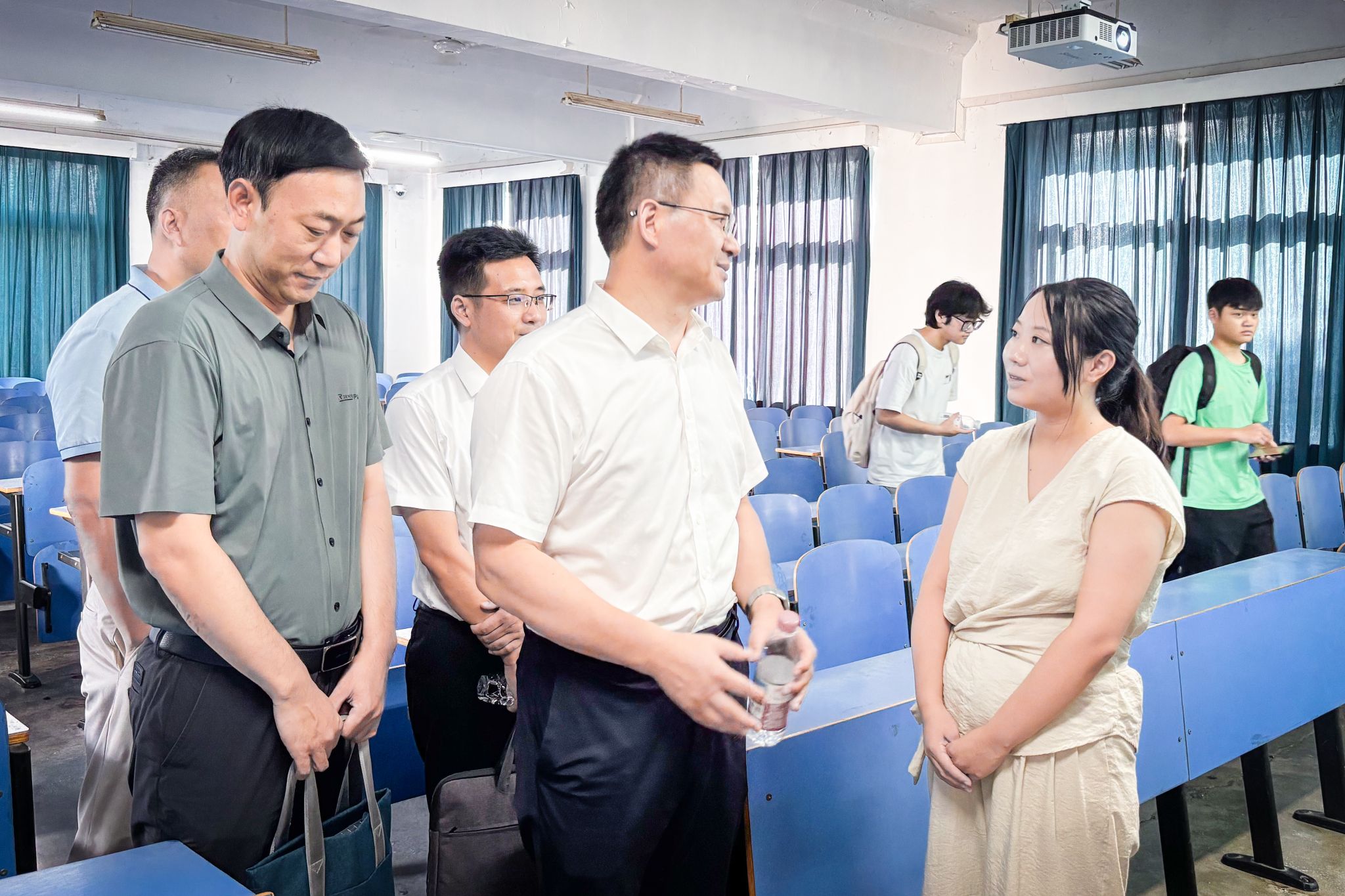 校领导认真听取教师们课堂讲解,在课后围绕教学内容、教学方法、课程思政等内容同授课教师进行了亲切交流。