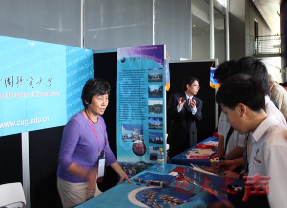 三、朱勤文副书记和我校工作人员在展台前接受咨询 。