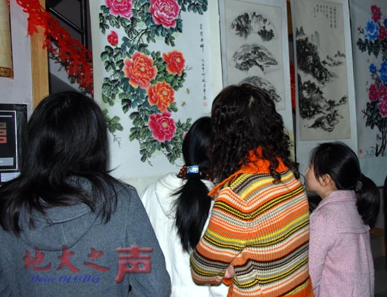 三、书画作品吸引了众多的师生驻足观看。(屠傲凌摄)