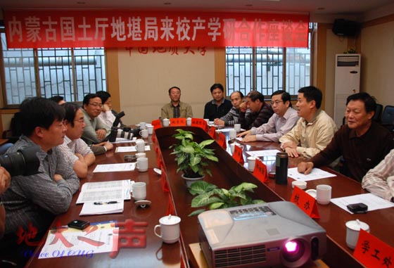 9月26日,内蒙古自治区国土资源厅副巡视员高华、内蒙古自治区地勘局副局长吕福生一行来校,就与我校展开产学研合作交流问题进行座谈,校党委书记郝翔,副校长邢相勤、唐辉明参加座谈会。(屠傲凌摄)