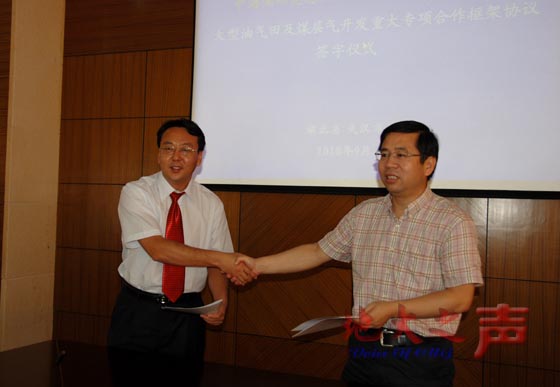 一、9月20日,中国海洋石油有限公司高级副总裁、中海油研究总院院长陈伟一行来校,与我校签订大型油气田及煤层气开发重大专项合作框架协议,校长张锦高,副校长邢相勤、唐辉明参加签字仪式。