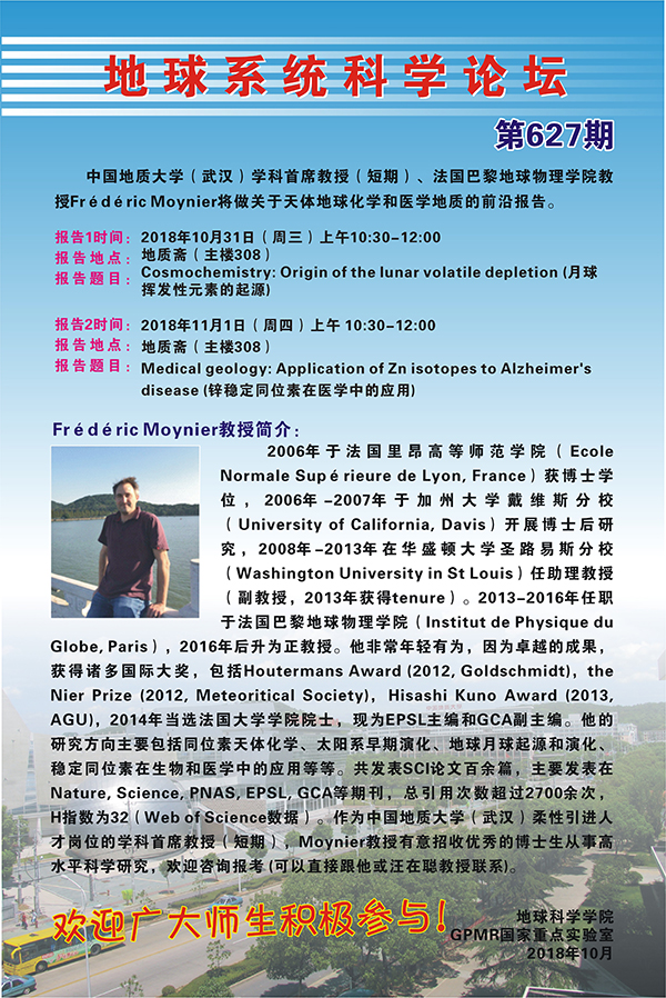 [10月31日-11月1日]地球系统科学论坛:法国巴黎地球物理学院Frédéric Moynier教授学术报告