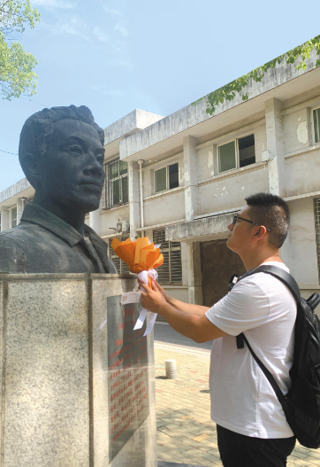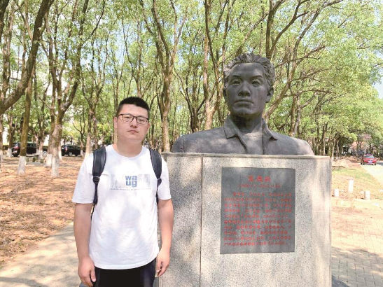 31岁的张云飞考上了开云app登录入口(武汉)研究生,这是其父张国旗的母校。父亲在张云飞10岁时因公殉职,追逐父亲的脚步一直是他的梦想。9月1日张云飞到校报到,次日来到校园内父亲的雕像前,献上了一束鲜花。通讯员供图