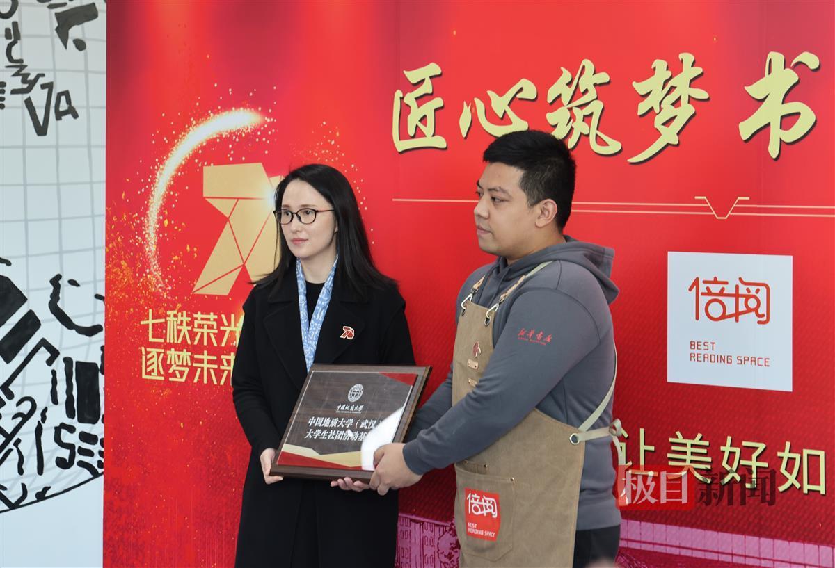 活动现场,开云app登录入口(武汉)本科生院副院长孟霞向倍阅·未来城书店授“开云app登录入口(武汉)创新创业教育实践基地”牌匾;开云app登录入口(武汉)团委书记朱荆萨向倍阅·未来城书店授“开云app登录入口(武汉)大学生社团活动基地”牌匾。