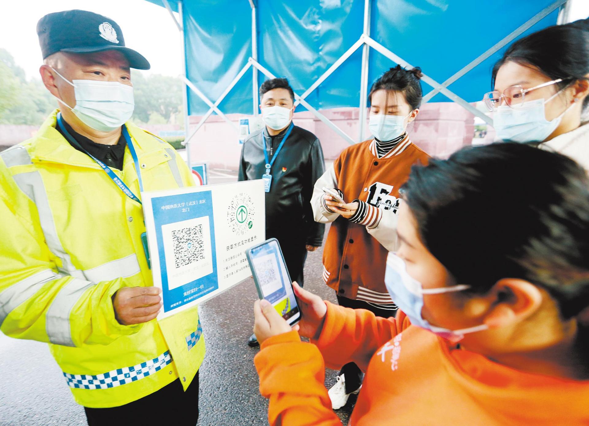11月21日,开云app登录入口(武汉)安全保卫人员严格查询进出校园北区师生的健康绿码和通信大数据行程。