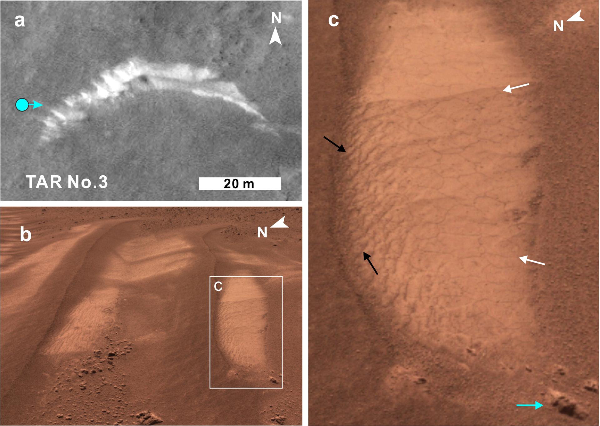 “祝融号”着陆区横向风成脊的演化模式及表面多边形裂隙可能的形成机制。课题组供图