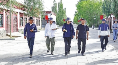 7月22日,格尔木市长江源民族学校校长李军(左三)为“沿着长江读懂中国——万里长江行”探访调研团讲解该校以生态文明为特色的校园文化。