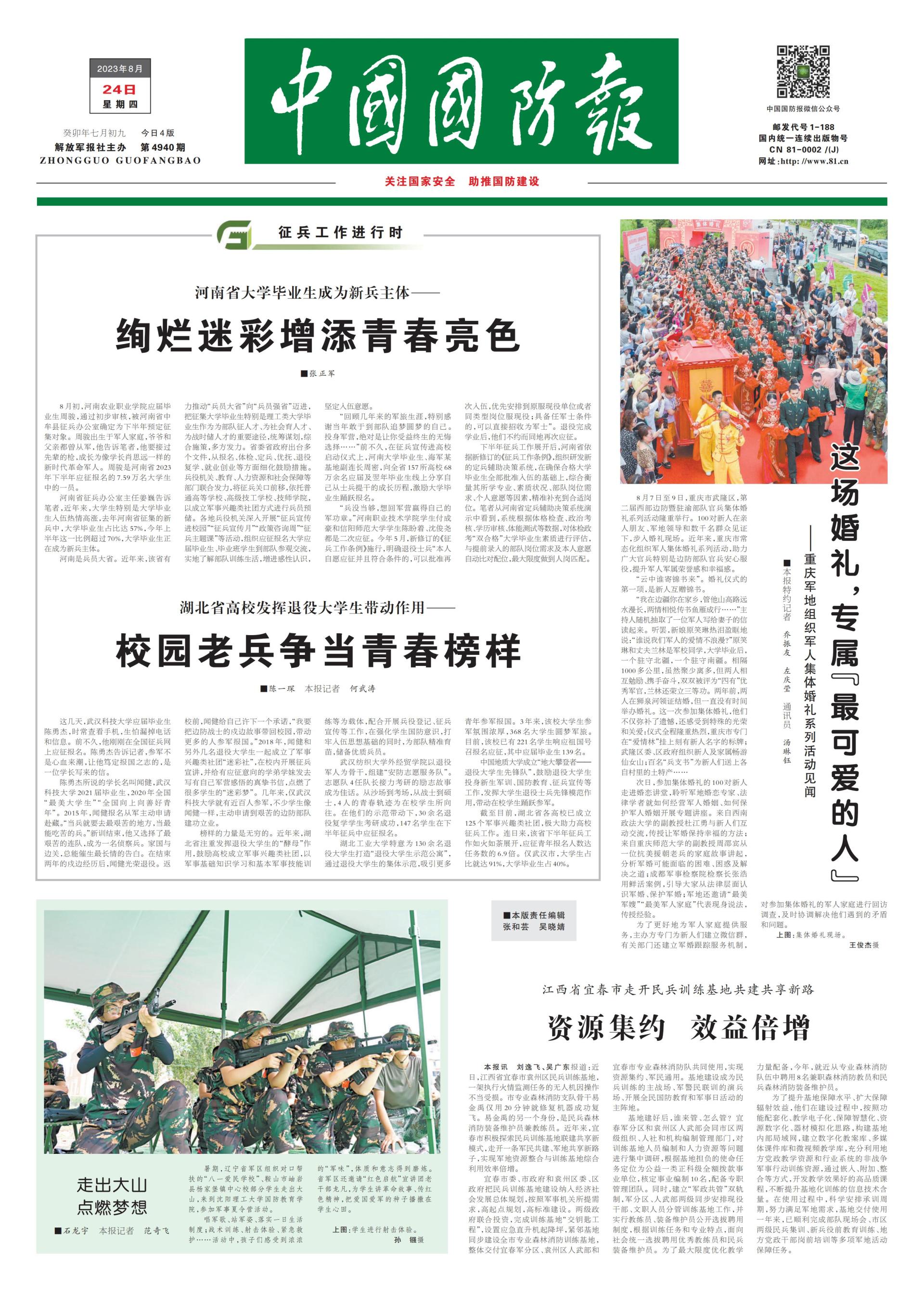 榜样的力量是无穷的。近年来,湖北省注重发挥退役大学生的“酵母”作用,鼓励高校成立军事兴趣类社团,以军事基础知识学习和基本军事技能训练等为载体,配合开展兵役登记、征兵宣传等工作,在强化学生国防意识,打牢入伍思想基础的同时,为部队精准育苗,储备优质兵员。