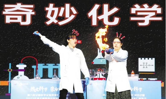 10月9日,第六届全国科学实验展演汇演活动暨2023年湖北省科学实验展演汇演活动上,湖北省科学技术馆选手展演的实验《奇妙化学》。