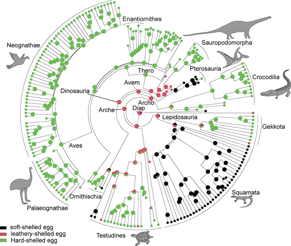 为了研究恐龙及其他爬行动物在繁殖方式上的宏演化规律,研究人员在前人的基础上收集了爬行动物210个类群,并对所有类群的蛋壳类型和蛋壳厚度等指标进行了统计,建立迄今最大的爬行动物数据库。在此基础上进行了祖先状态恢复分析,结果表明最早的恐龙蛋为革质蛋,外壳柔软似皮革,柔韧不易碎,不同于先前的软壳蛋(无或极薄钙质层)和硬壳蛋的起源。鳄类、恐龙和翼龙在演化的过程中蛋的相对大小呈现递增的趋势。而在蛋的形态变化上,最早的恐龙为亚圆形或椭圆形,兽脚类恐龙明显有延长的趋势。另外还发现大多数爬行类在演化的过程中均有蛋壳增厚的趋势。