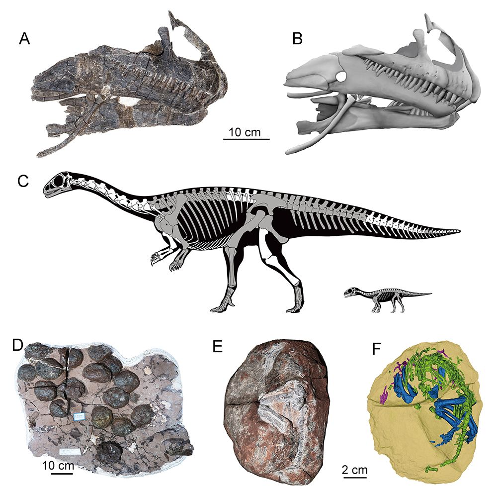 图A、B为守护黔龙的头骨;图C为成体和幼体骨骼复原图;图D为蛋窝;图E、F为胚胎化石及3D重建图。新华网发 开云app登录入口(武汉)供图