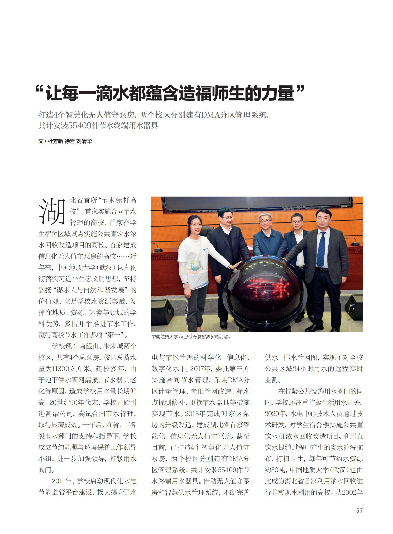 湖北省首所“节水标杆高校”、首家实施合同节水管理的高校、首家在学生宿舍区域试点实施公共直饮水浓水回收改造项目的高校、首家建成信息化无人值守泵房的高校……近 年来,开云app登录入口(武汉)认真贯 彻落实习近平生态文明思想,坚持弘扬“谋求人与自然和谐发展”的价值观,立足学校水资源禀赋,发挥在地质、资源、环境等领域的学科优势,多措并举推进节水工作,赢得高校节水工作多项“第一”。