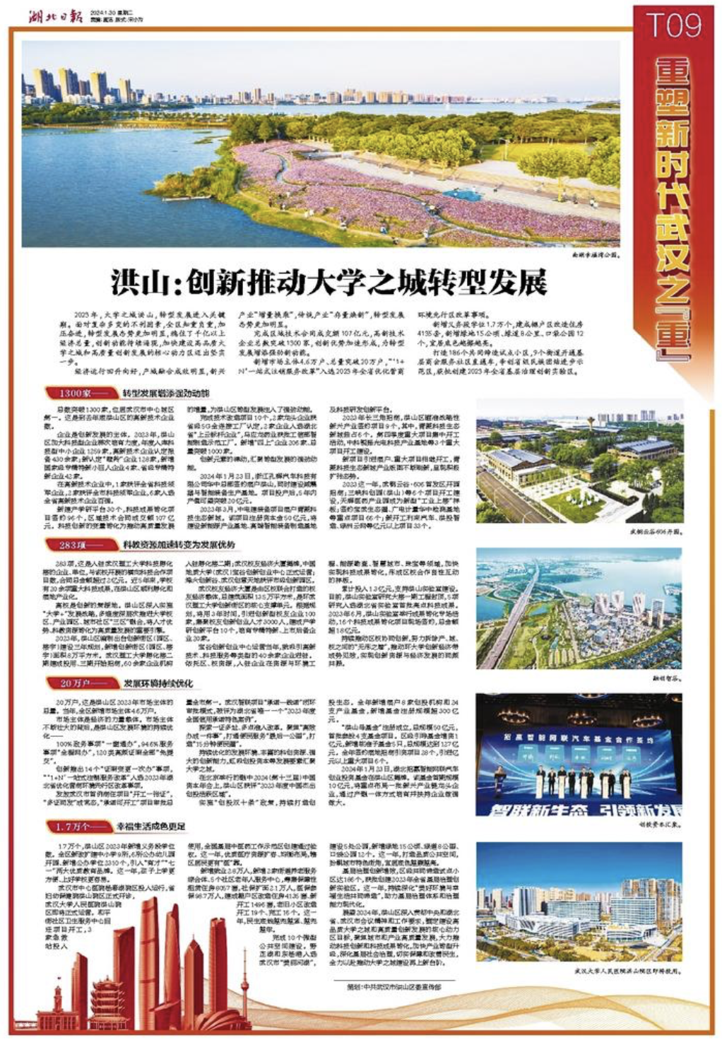 展望2024年,洪山区深入贯彻中央和湖北省、武汉市会议精神和工作要求,锚定建设高品质大学之城和高质量创新发展的核心动力区目标,聚焦城市和产业高质量发展,大力推动科技创新和科技成果转化,加快产业转型升级,深化基层社会治理,切实保障和改善民生,全力以赴推动大学之城建设再上新台阶。